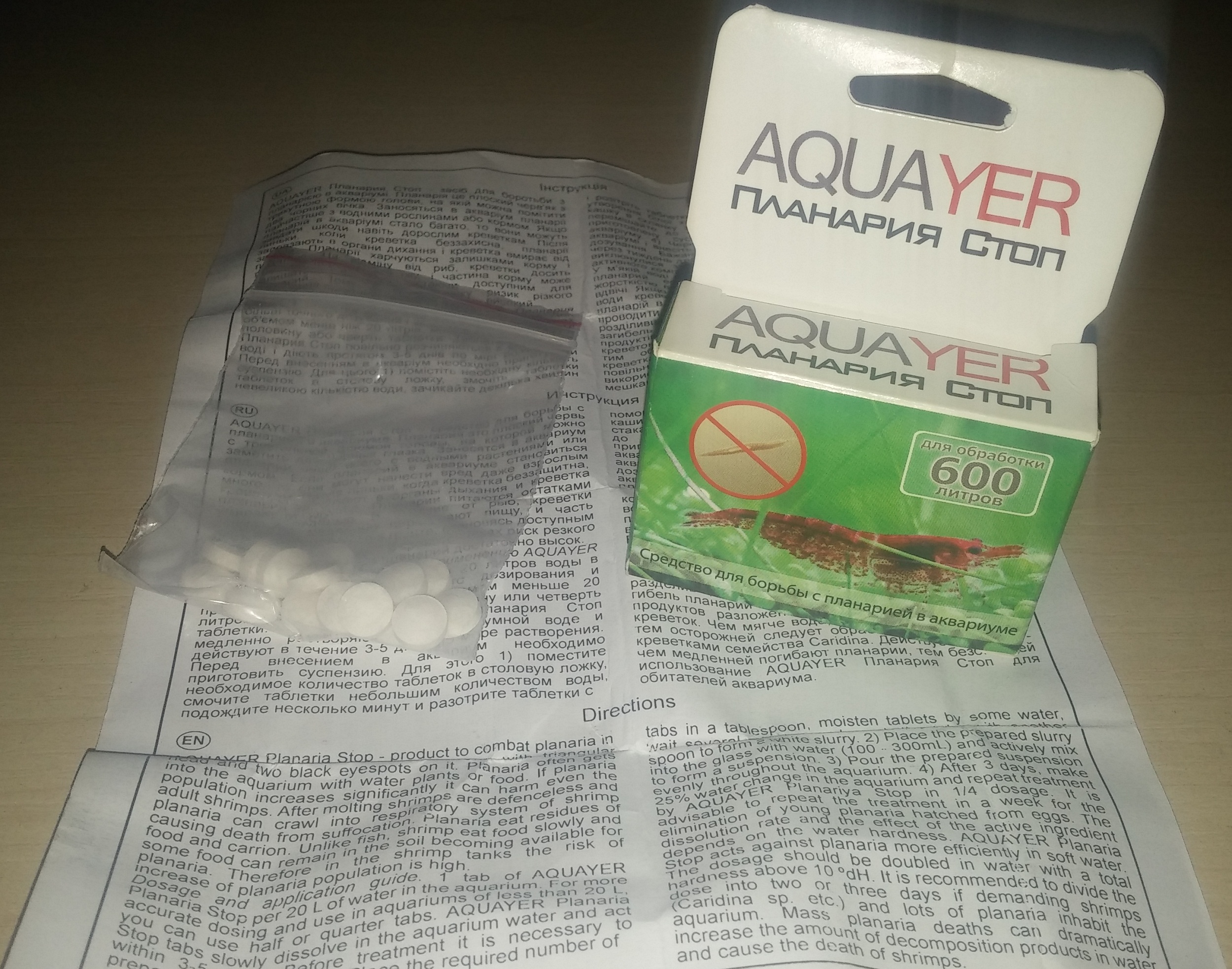 «Планария стоп». Заказал его в интернет магазине в Харькове и сразу же в тот же вечер по рецепту сделал так, как было написано. Нетто объем воды моего аквариума около 120 литров, я взял 5,5 таблеток. Таблетку размял чайной ложкой в столовой с каплей воды и уже сам порошок перемешал в стакане до практически полного растворения, мелкие песчинки остались. Затем залил суспензию в аквариум, стараясь распределить ее по всей площади. Вода естественно слегка помутнела, песчинки попадали на растения и по всему грунту. С листьев я аккуратно рукой посмахивал бОльшую часть, чтобы жители не посчитали это за корм.