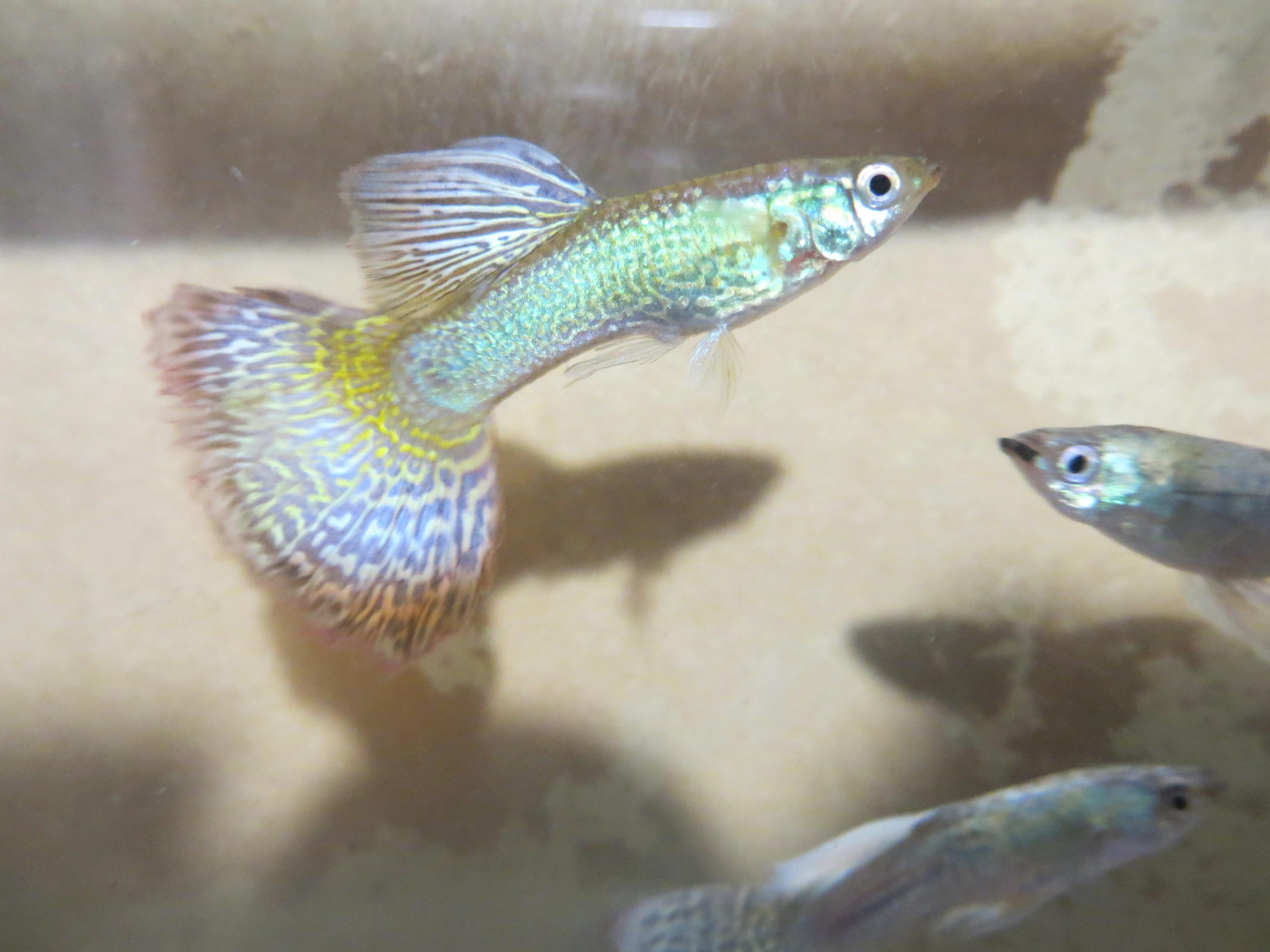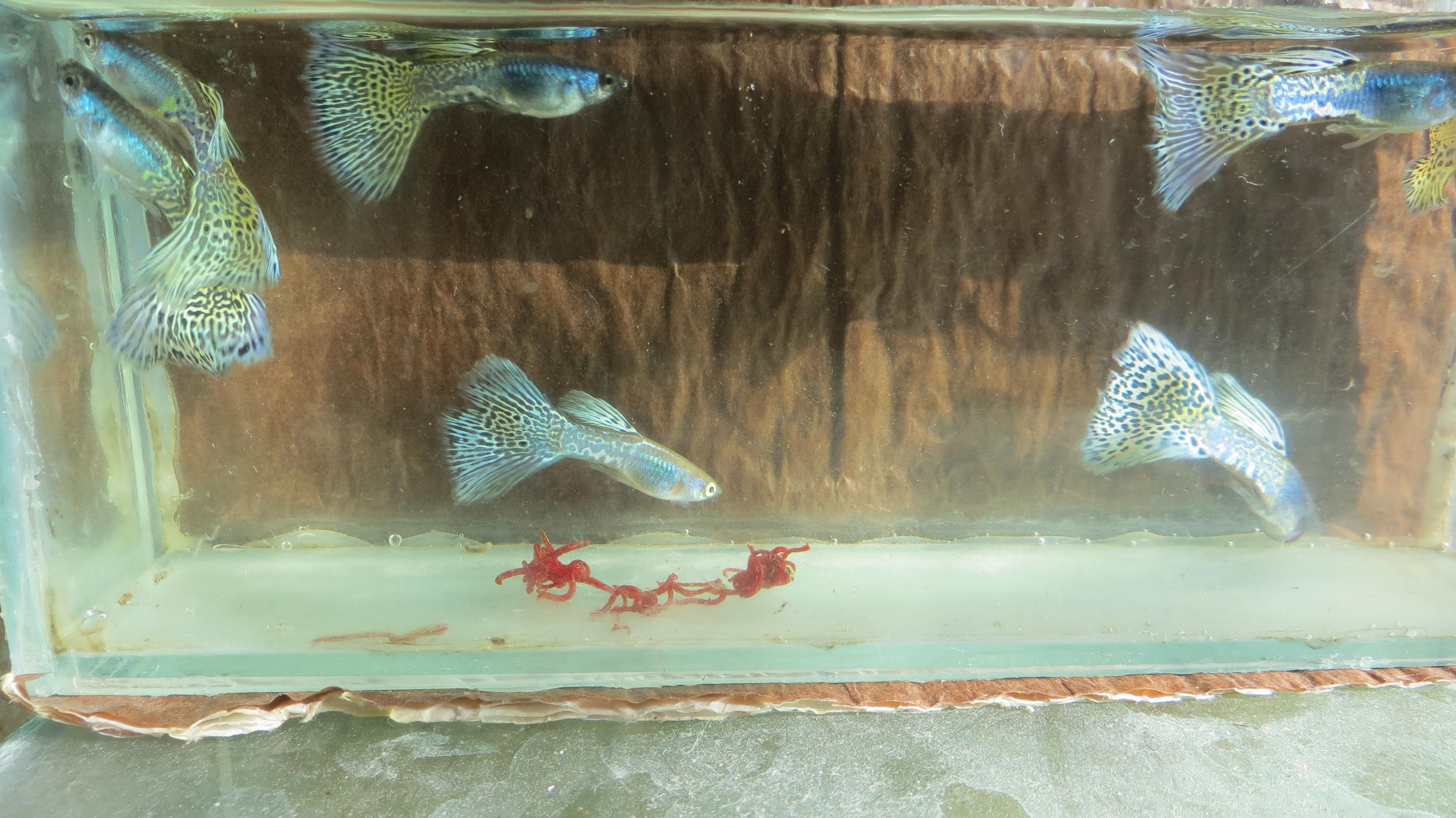 Ось такі вийшли правнуки-діти від самця з верхніх постів. На відео самий зрілий з самців, інші такого ж плану, різняться відтінком коричневого у забарвлені хвоста та плавців. Чотири з 12 самців мають темно синій хвіст.