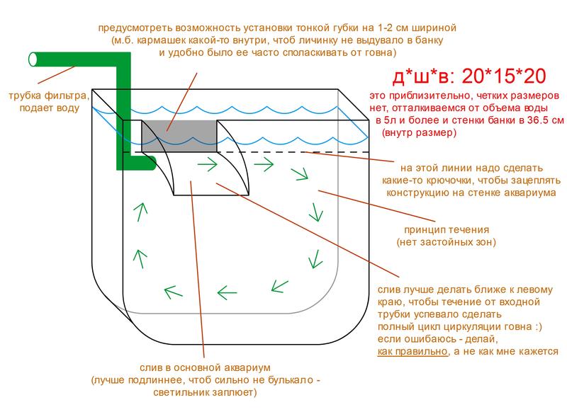 У меня есть (было) четыре 20-литровых отсадника на случай, если. Один я разрезала, попросила напилить боковые стекла и дно пополам, чтобы потом склеить девайс поменьше. Смывка для силикона на вид и запах опасности не представляла, перчатки были отброшены за ненадобностью, но с непривычки банку я переклеивала 4 раза, пока не осталась относительно довольна результатом. И без кожи на руках. Это потом читка мелкого шрифта состава определила ортофосфорную кислоту. Так то - потом. И все для чего? Для того, чтобы получить аквариум поменьше, в котором течение от аэрации будет достаточным для личинок. Теперь у меня три 20-литровых отсадника и один 10-литровый. Валяются в кладовке. Ибо местный автор много думал, пока клеил и нарисовал такую схему: