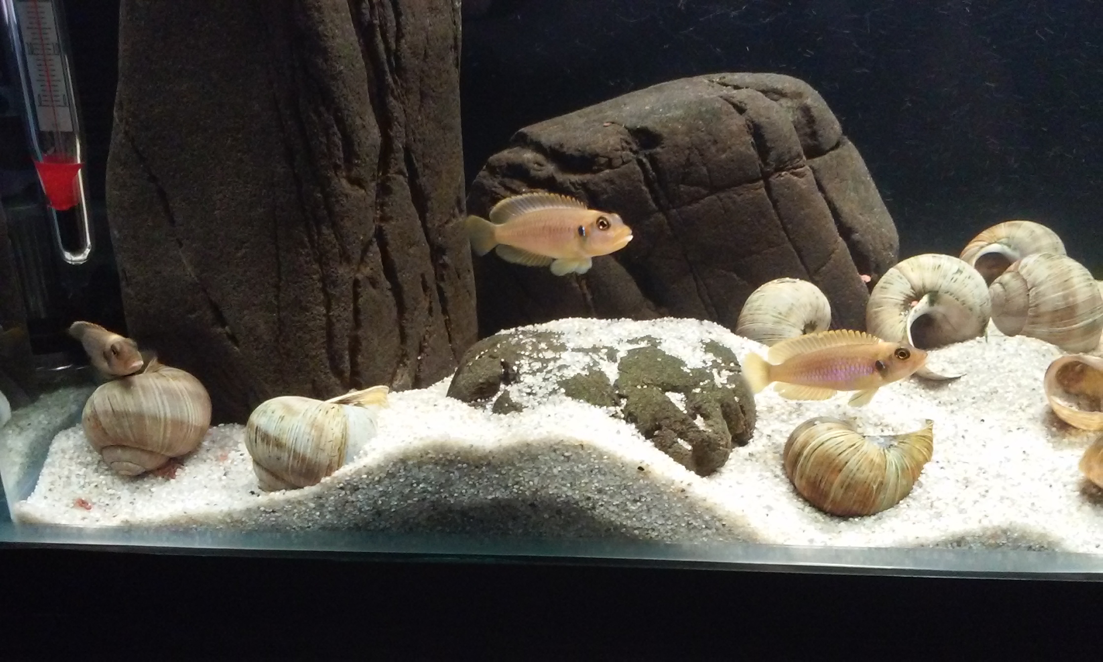 Через несколько дней приехали рыбки. После долгих мучений все же было принято решение поселить Lamprologus ocellatus "Gold". За рыбку спасибо жителю Днепра, форумчанину OLEG DP . Рыба приехала здоровая и бодрая. Отдельное спасибо за бонус. Итого по населению: 5 лампрологусов.