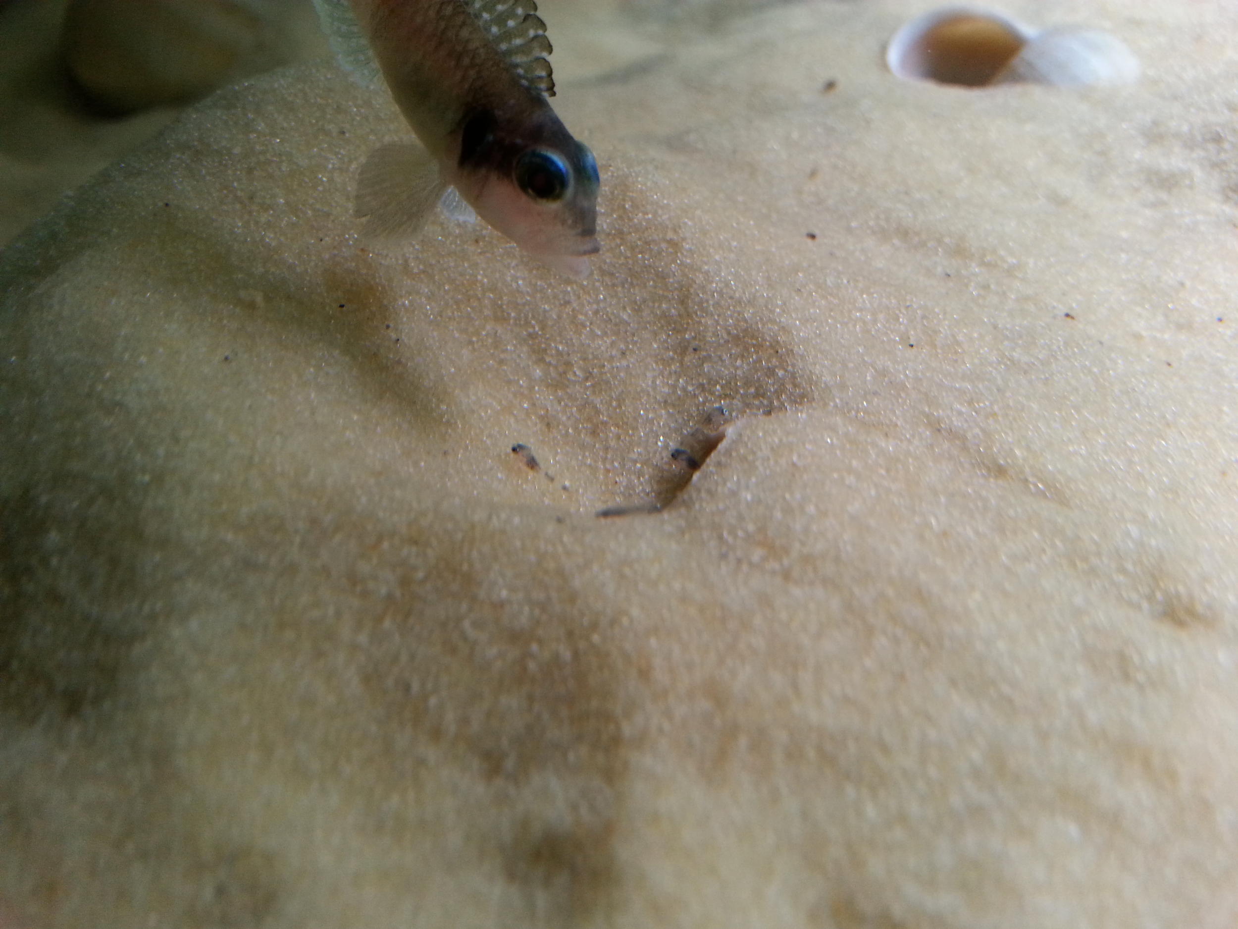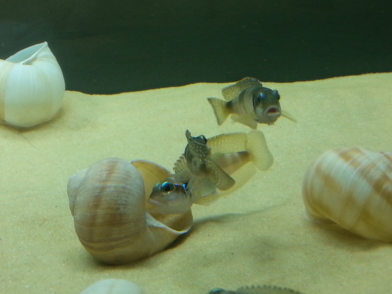 Панове, продовжую!)) На відстані 25см від першої мушлі спостерігаю ще одне гніздо з мальками. Цікава різниця у поведінці самок - перша закопала мушлю рівно з піском і ДУЖЕ ревно охороняє малька, мальки рідко коли вилазять, бо вона їх заганяє назад. А інша (а в неї я нарахував десь 12 мальків) - навпаки викопала мушлю + викопала рів навколо неї і мальки в тій заглибині "пасуть" артемію. Крім того самочка бере мальочка в рот, пожує, пожує його і випльовує в мушлю)) Тим часом самець займається третьою самкою!)) Поки дві самки не віднерестилися була страшна "Санта-Барбара")) Тепер - спокій!