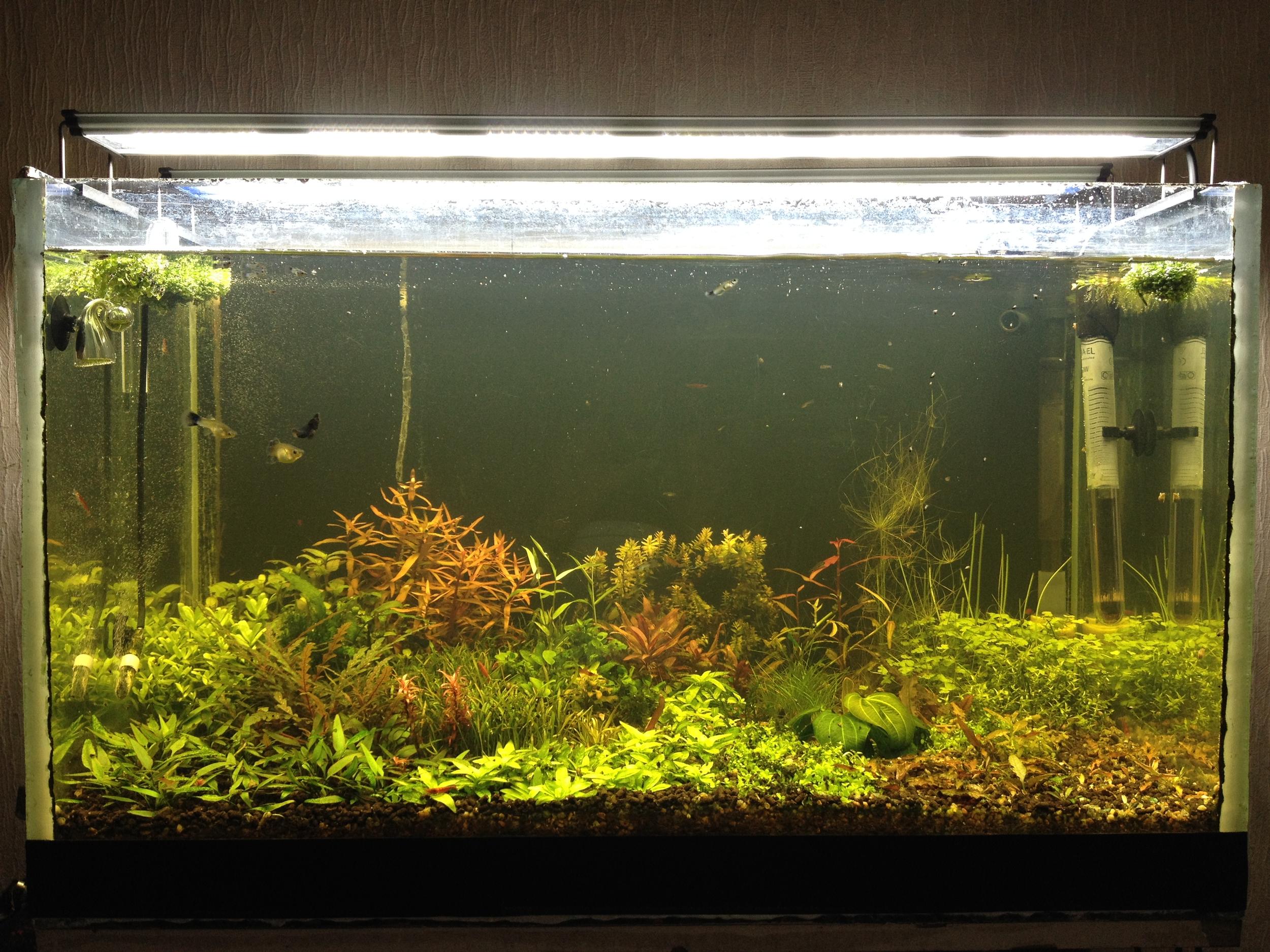 Много новостей накопилось с момента старта под новыми светильниками.Что я могу сказать ,это реально то что нужно для травника ,именно можно творить что хочешь.Светят они очень ярко .Сразу как поставил было 6ч 2 недели потом перевел на 8 .Единственное что было трудно это внесение макро ,железо и микро (аквасис) ежедневно по 2.Компенсировал внесение жидких удо земляной подложкой ,замачил литр повымывал с недельку ,потом через дуршлак и в банку ,померял тест ,фосфат зашкалил ,нитрат 30-40,вода коричневая как чай ,неделю подмена ежедневно по 50 %,вроде все хорошо по виду ,краску почти вымыл.Растения пузырять стали очень сильно и самое главное перестали стекла зеленеть ,зеленка задолбала ,по началу воопще таких креньделей давала ...вечером почистил стекла утром уже налетик заметен.Потихоньку наращиваю шапки.