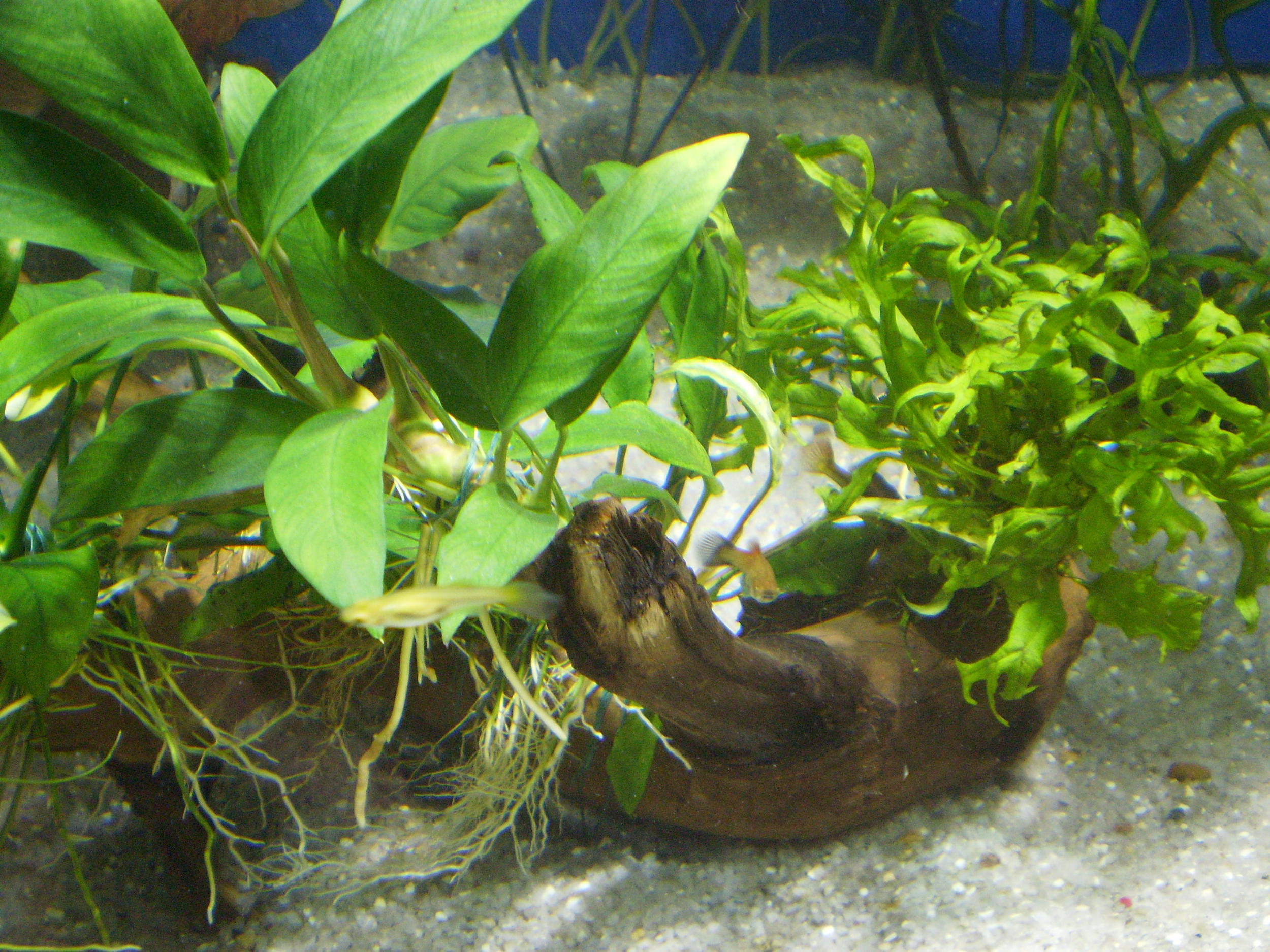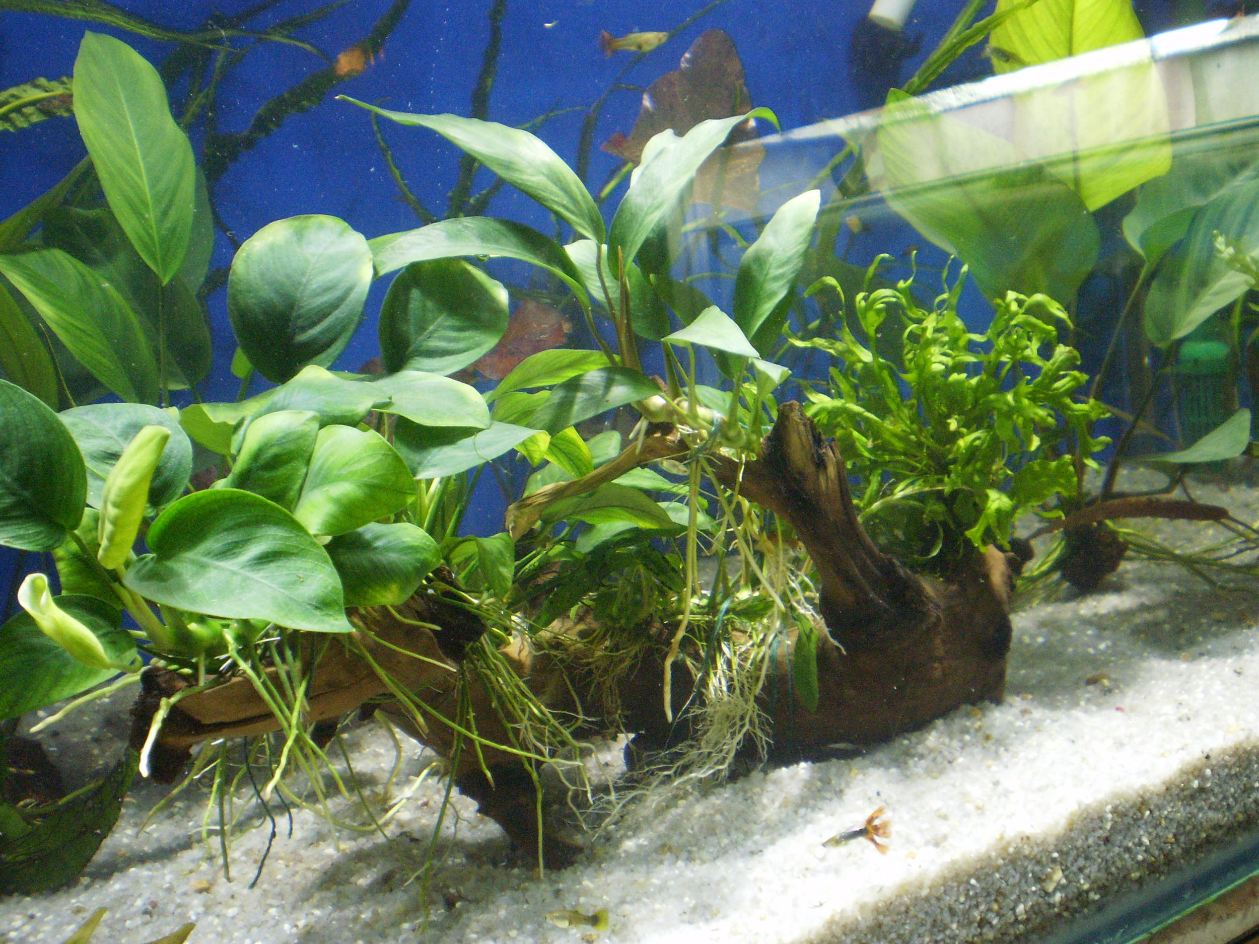 Набор растений изначально планировался из медленнорастущих:папоротники много видов,перечислять не буду,анубиасы несколько видов перекочевали из моих поллюдарумов туда,криптокорины,2 куста нимфеи, ну и т.д.Была всунута коряга с приличным куском свинца,т.к не тонула,к ней привязал анубиасы,папоротники все были примотаны на куски колотой лавы.Из рыбок как всегда-живородка,немного харацинки,коридорасы и брохисы