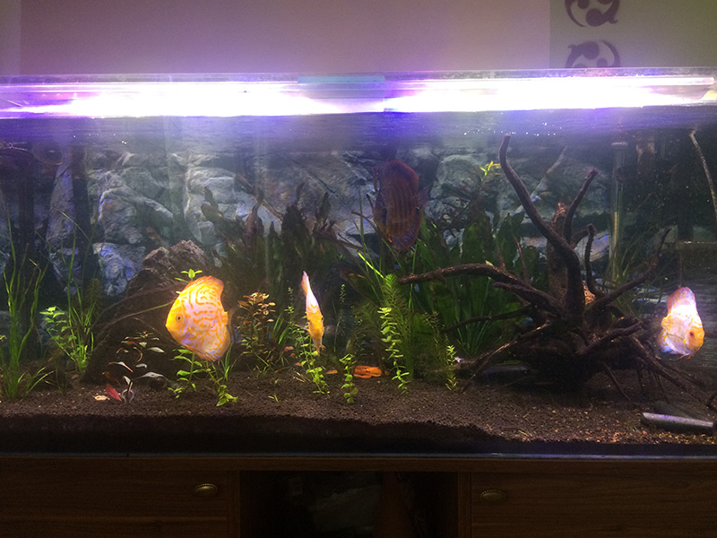 120 литров. восьмиполосые цихлазомы 7 шт. текущая концентрация 90 мг/л. из особенностей - "дышащий фильтр" (Ехейм Вет-Драй). Фотки вечером.