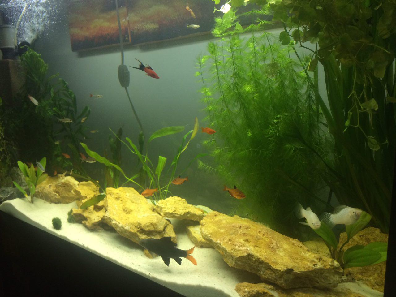 налили воду из под-крана, поставили фильтр и так 2 дня фильтровалась до прозрачности, потом из маленького переселили в большой рыбок