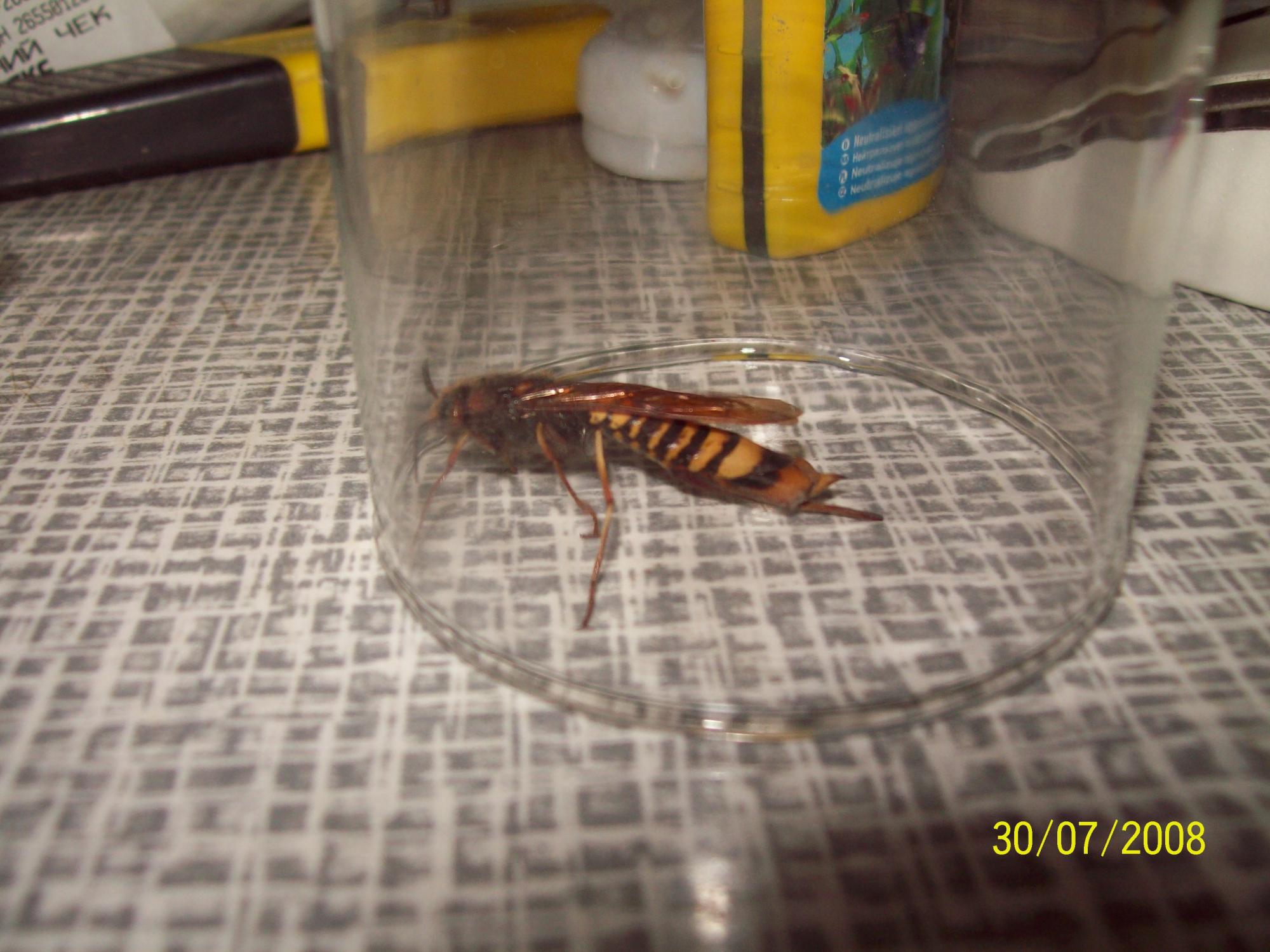 В пылу разговора мы не сразу заметили неладное. Среди обычных ос начали появляться особи в 2,5-3 раза крупнее своих собратьев. Знаете ли... Мороз по коже пробежал.... Ну, я, как истинный натуралист, изловил одну стаканом (пьяная оса утрачивает скорость реакции). Фото прилагаю. Хочу заметить, что это именно оса. Жало - можете себе представить!