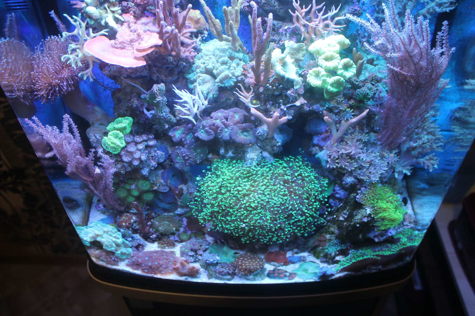 Запущен ровно год назад в конце сентября. Все полностью адаптировано и функцианирует идеаль, без колхоза. Свет леды с контроллером на блютусе с большим запасом мощности,с холодильником пр-ва италия.Имеется встроенный в крышку термостат с вентилятором.Косметика в отличном состоянии.Тумба пр-ва акватика с усиленной столешницей. Живность прекрасно себя чувствует и радует глаз.Аквариум чистейший,без мусора и детрита.Рыб не было,только беспозвоночные.