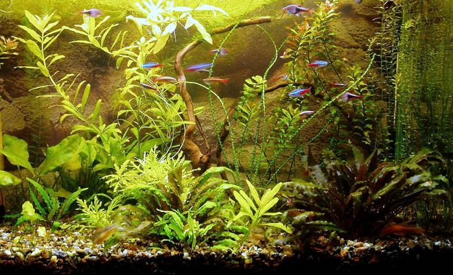 ИМХО - гуппи хороши в видовом аквариуме, ну или среди нескольких моллинезий, пецилий. А харацинки и мелкие карповые, мне кажется, не лучшие соседи чисто визуально. Им бы себе подобных - блестящих, мелких, стайных.