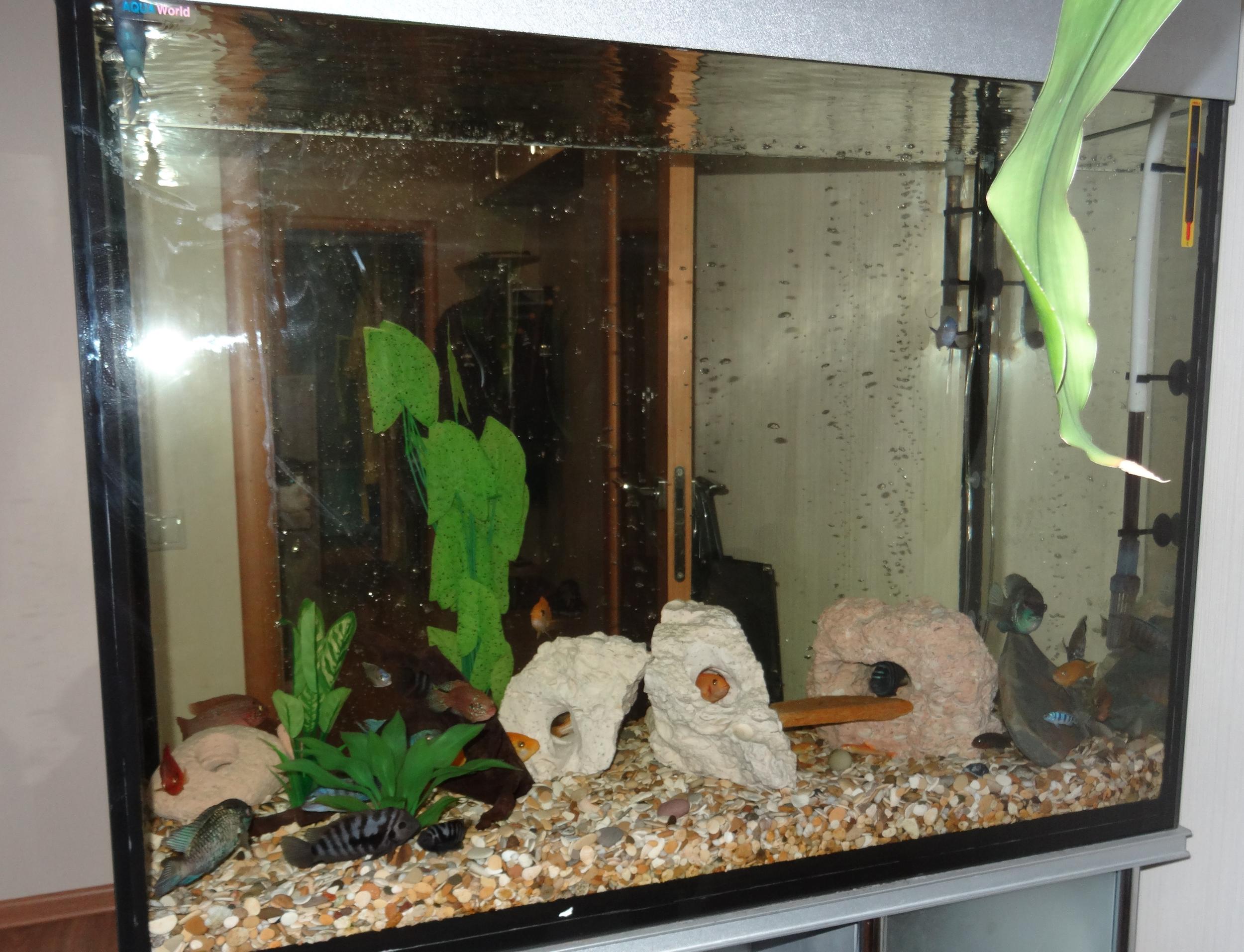 385л, аквариум высокий, т.к раньше в нем жили астронотусы см под 30-35. Сейчас разные цихлиды.