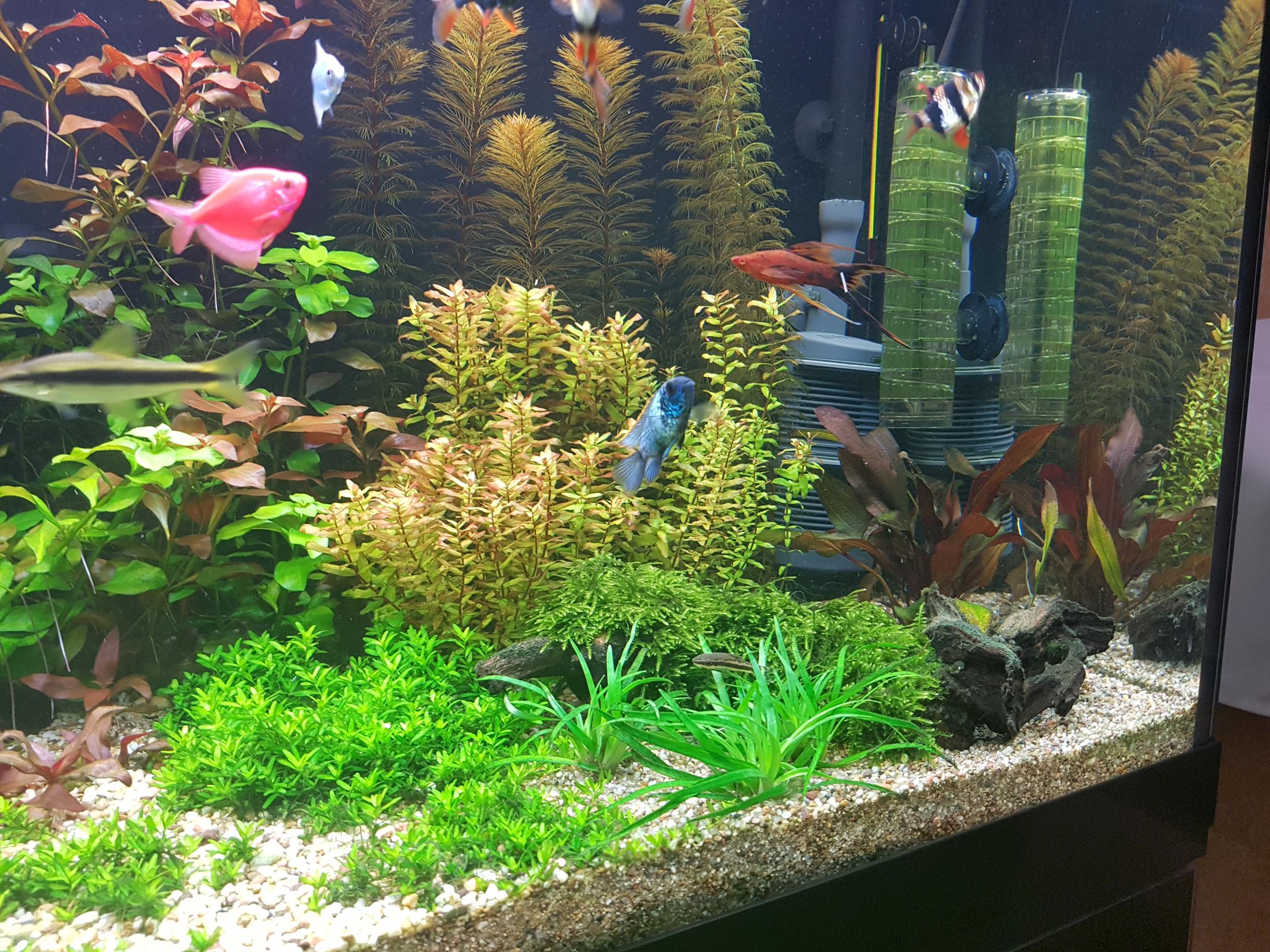 Оборудование: фильтр jbl1501 внутри эйхамовский субстратпро, со2 система баллон на таймер (подача jbl taifun, контроль дропчекер зеленый), температура 26. Население: 4 скалярии чуть больше 1 грн, 4 меча, 8 барбусов, 4 анцитруса ( самый большой 5 см, маленький самый бриллиантовый около 3 см), около 10 тернеций, 2 Sae, 2 наннакары неон блю, 2 отика, около 8 коридорасов(мелочь, штебра и венесуэльские). Свет 3×54 Вт спектр 880, 830, 865. На двух лампах установлены отражатели. Свечу 11 часов.