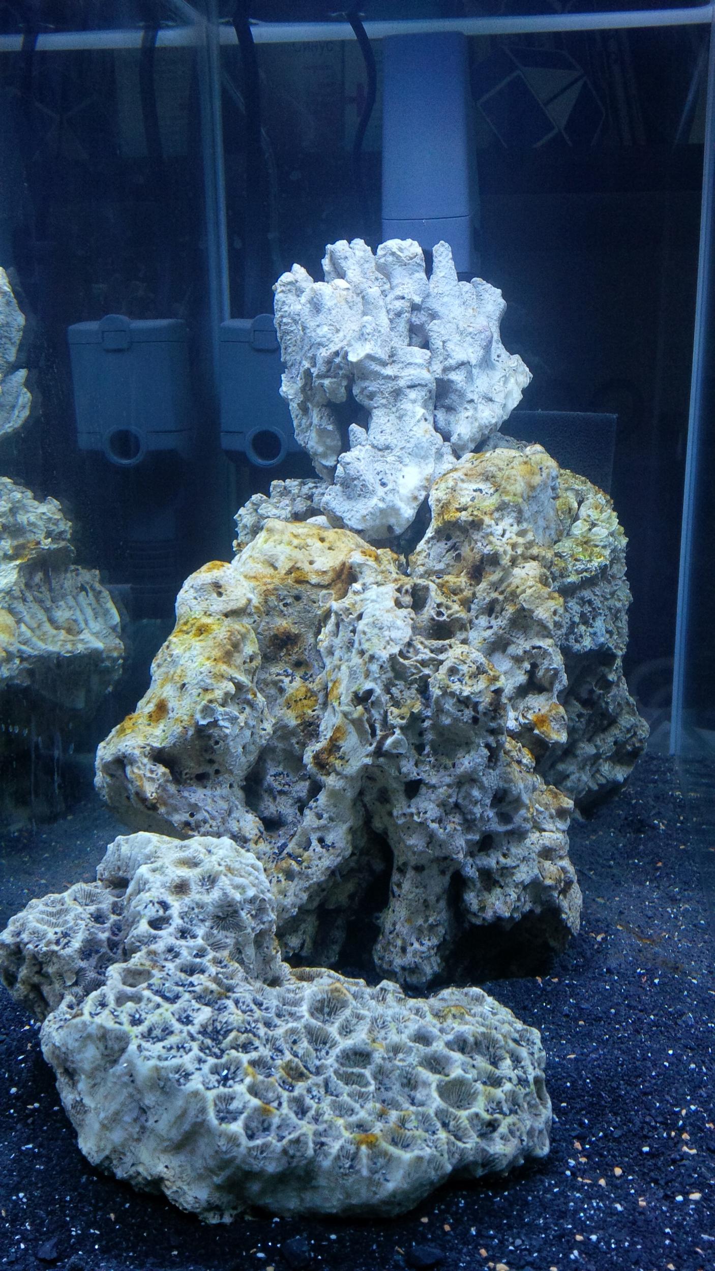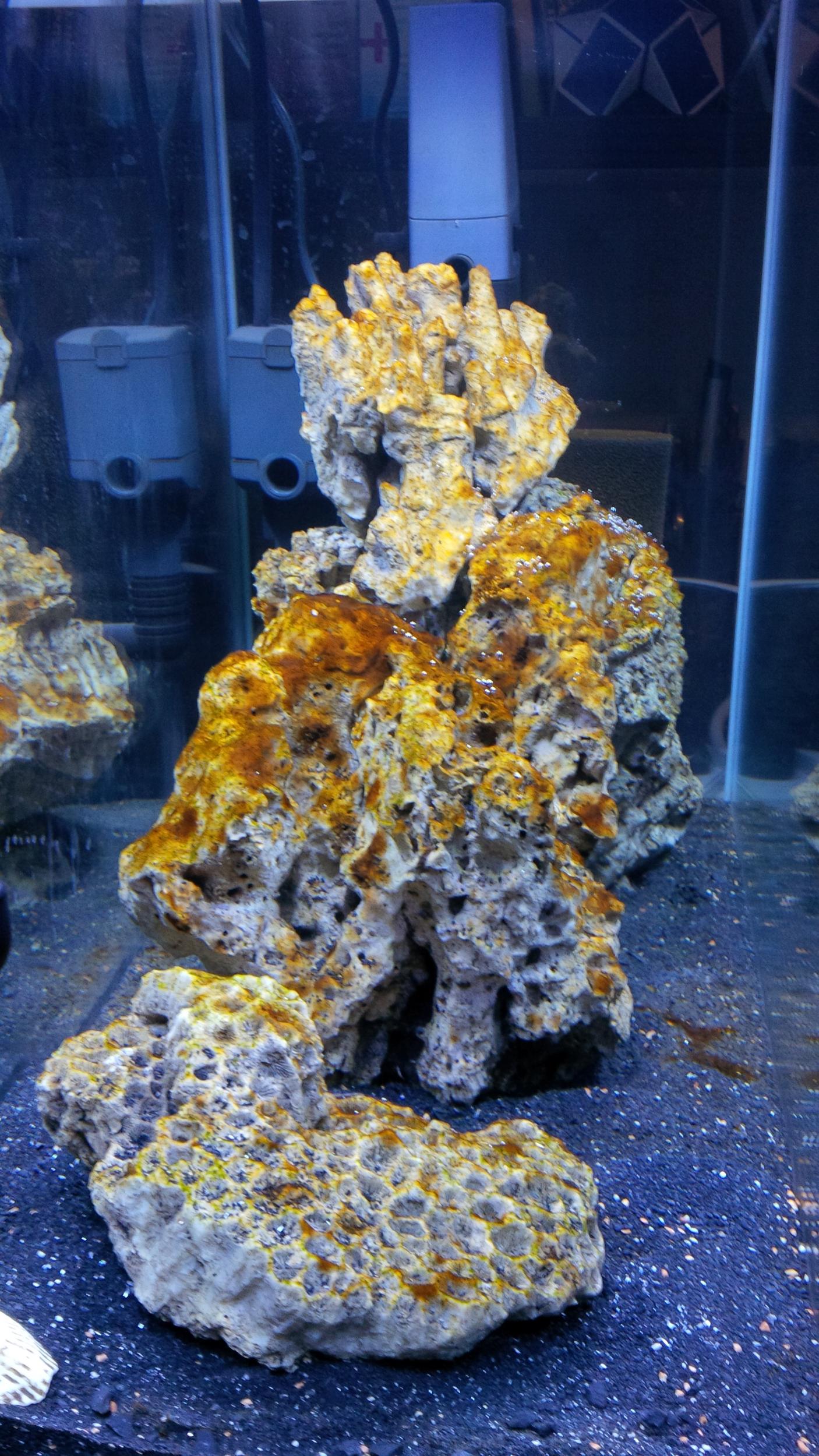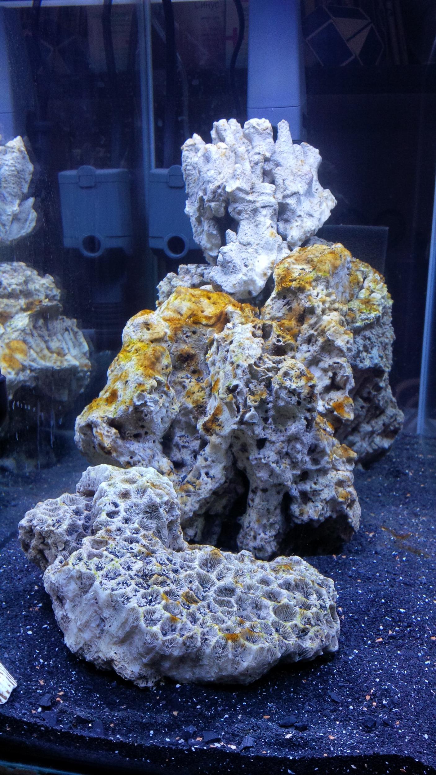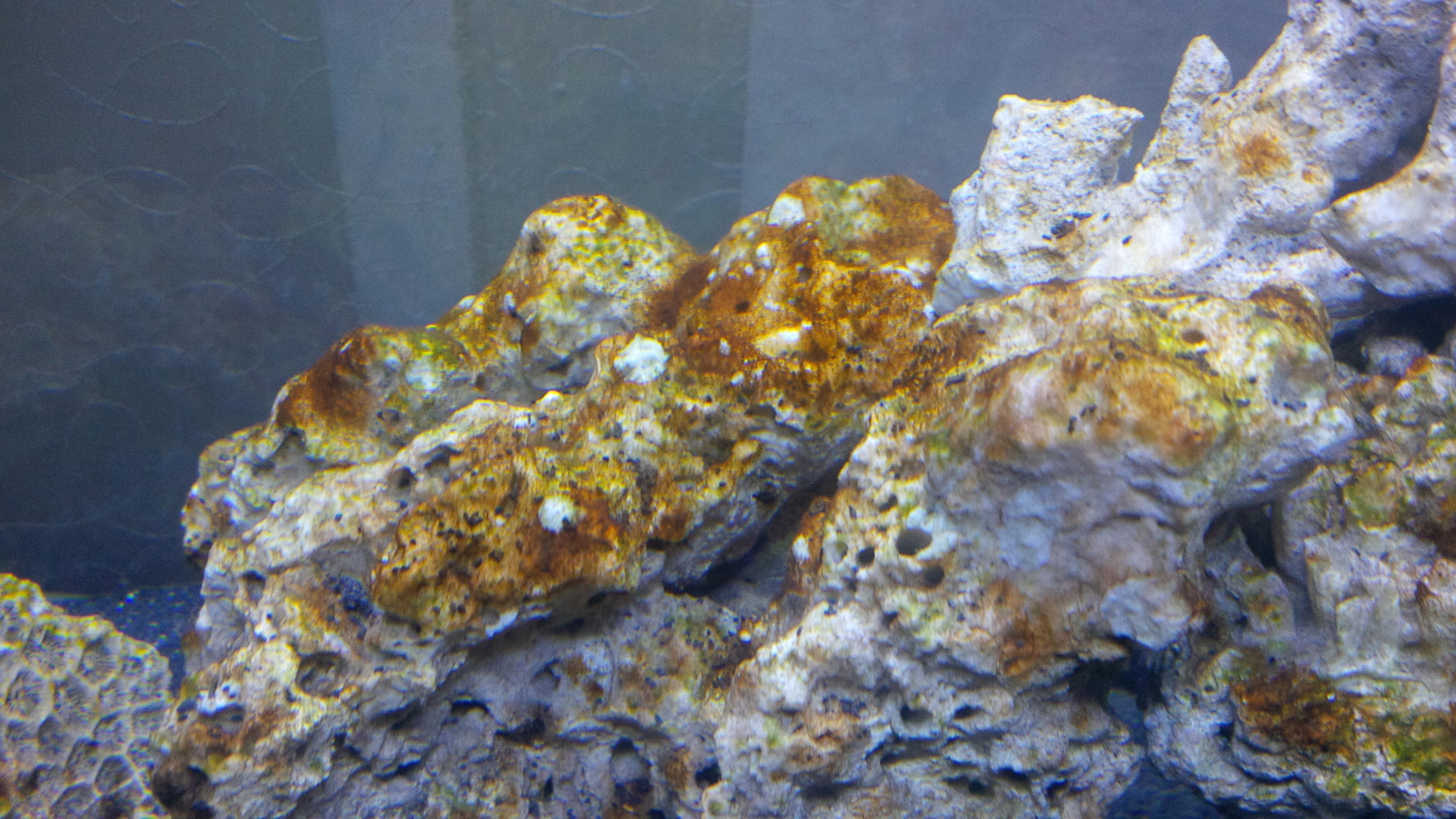 Здравствуйте. Помогите пожалуйста определиться. Запускаю море, объём очень маленький 27 л. Как только нитриты, нитраты и фосфаты стали нулевыми, полезла эта фигня... Сначала стали зелёными стенки аквариума, к сожалению этого фото нет, потом с камнями начались приключения, фото прилагаю... Повторюсь, нитриты, нитраты, фосфаты нулевые! Один день не включал освещение и тут же "этого" стало меньше, но появились какие то белые пятнышки, даже глядя своими глазами не пойму что это такое, может просто камень на фоне ржвавого цвета выглядит более белым?! Диатома вроде как свет не любит, а тут всё наоборот, и на вид тупо диатома! Не пойму! И питаться чем, с нулевыми показателями нитратов? Когда нитритов и нитратов была куча, всё было чистое как стёклышко! Я в замешательстве?