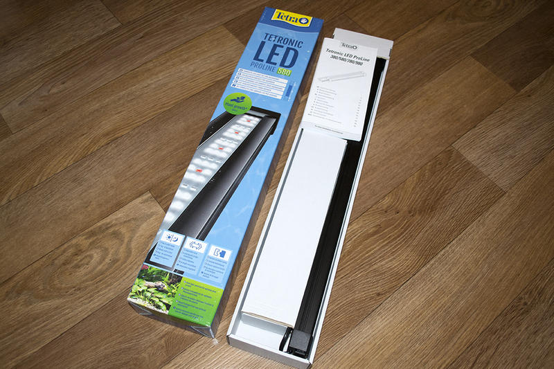 Для аквариумов открытого типа есть крепление Tetronic LED ProLine Arms (покупается дополнительно). С его помощью светильник крепится на заднее стекло. Это крепление я и буду использовать. Как выяснилось длинна аквариума такова, что светильник можно установить на боковые стенки только с плотно прижатыми к корпусу ножками, при этом сильно перегибается сетевой шнур, что в процессе эксплуатации возможно(!!!) приведет к его повреждению. Заявленные характеристики: - выходное напряжения БП – 12В