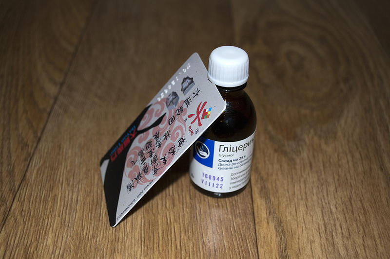 Отрезаем фон по размеру, сделав запас с каждой стороны. Протираем стекло спиртом, чтоб убрать случайные пятна. При этом стараемся использовать не ворсистую ткань, так как попавшие ниточки или пылинки под фон, не красиво будут смотреться. Далее выливаем глицерин на стекло и размазываем по всей площади. Он не даст пленке сразу приклеится и в случае перекоса можно будет с легкостью снять фон и поправить. Прислоняем пленку к стеклу и с помощью пластиковой карты постепенно разравниваем, хорошо прижимаем, выгоняя воздух и излишки глицерина.