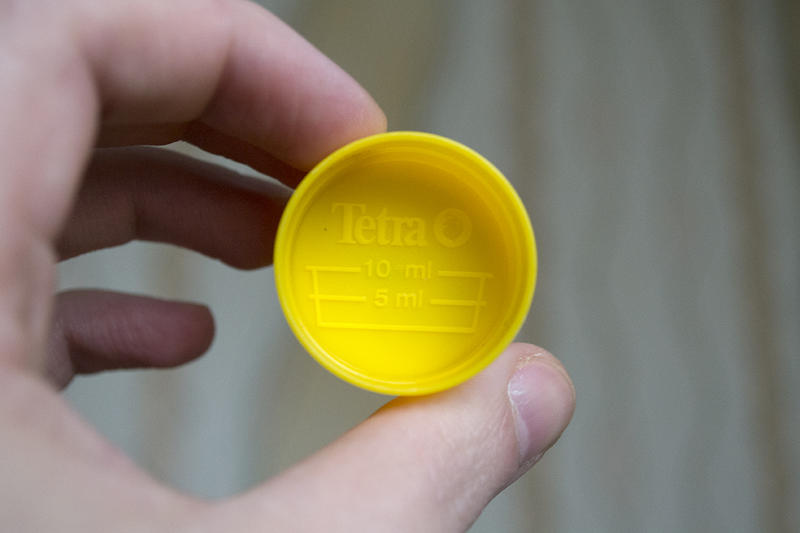5. Добавляем в наполненный аквариум Tetra AquaSafe из расчета 5мл на каждые 10л аквариумной воды. Так как я использую водопроводную воду, данный кондиционер думаю будет полезным. Для удобства на колпачок нанесли отметки 5мл и 10мл. По информации производителя, Tetra AquaSafe – нейтрализует хлор, связывает тяжелые металлы, защищает слизистую оболочку и жабры рыб, содержит витамины. В дальнейшем буду его добавлять в подменяемую воду.