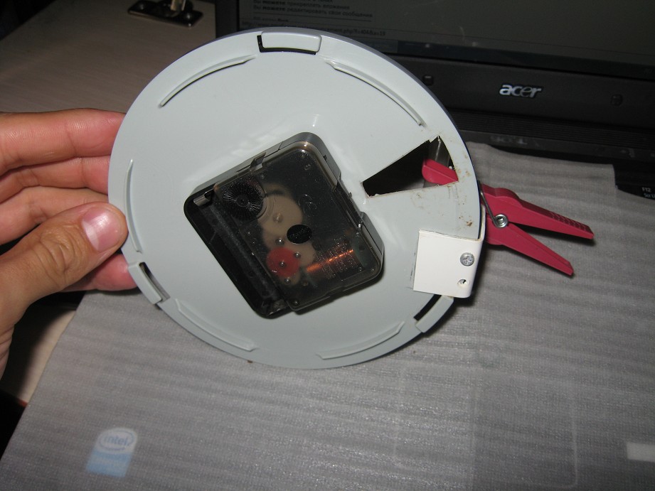 Состоит она с китайских настенных часов, нижней части от бокса для дисков, прищепки и кусочка трубочки, пластиковая бутылка. (Принцип данного изобретения встретил где-то на просторах нета). Настенные часы использовал по той причине, что у них большие стрелки, а у будильников маленькие (не удобно).
