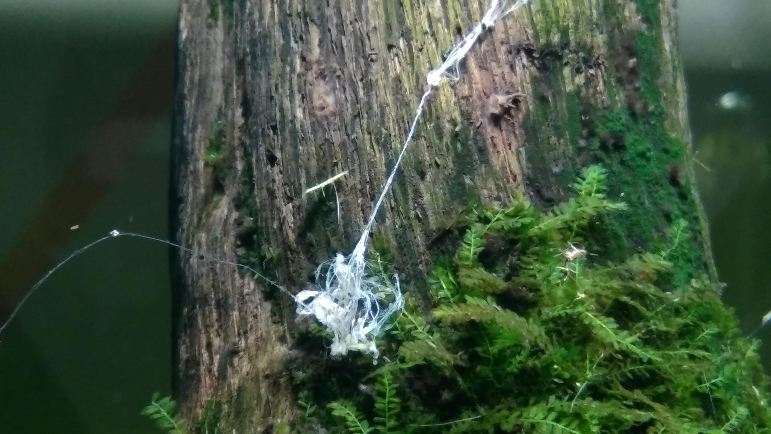 І все ж, з усіх можливих варіантів, на павука це схоже найбільше - дуже вже хаотично висять ці нитки, а гриби і слизовики ростуть дуже "геометрично". Щодо шансів побачити павука в малому об"ємі - павуки теж не дорослими народжуються... )) Позаглядайте під листочки