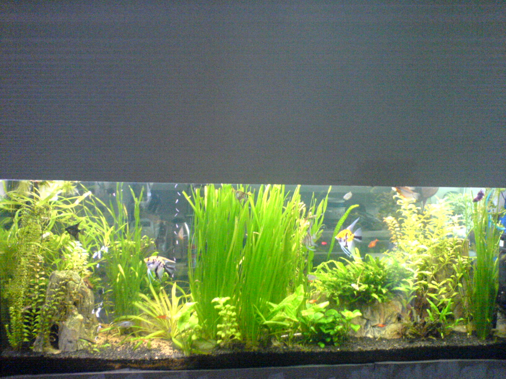 Валиснерия по центру выполняет роль барьера или разделителя территорий ,так как живут и мелкие цихлиды и еллоу,мне она даже нравится там так как она разделяет ещё и грунтовые зоны после неё выложена дорожка из крупной гальки ,потом песочек,а до неё только чёрный базальт.Если кажется что валиснерии по центру много ,то это потому как снято прямо,а на самом деле она идёт полосой в один ряд,только под углом,для асиметрии.