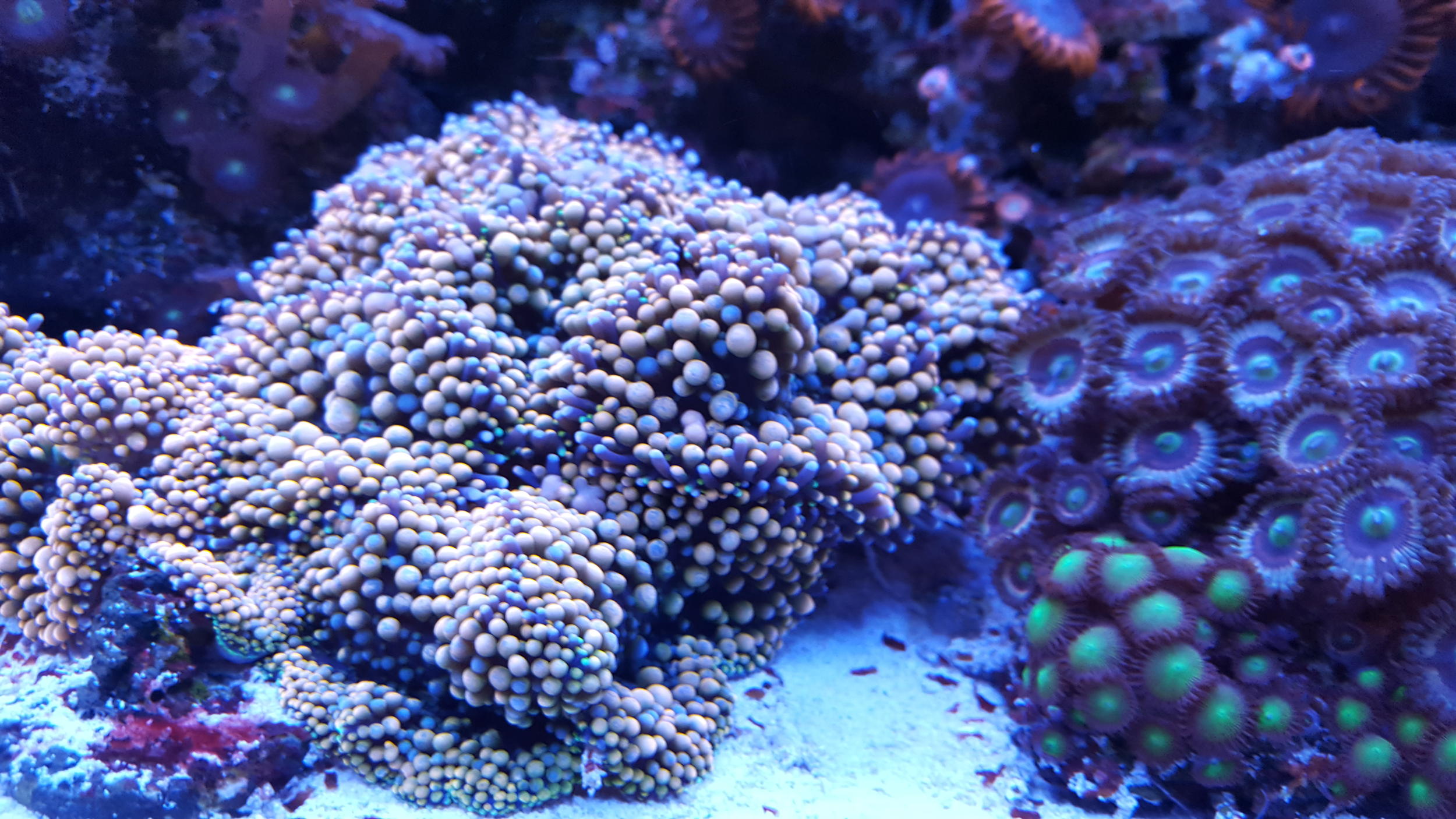 В двух словах.В банке присудствует около 20 видов зоантусов и палитой.Есть 2 колонии по 40-50 голов,1голова из которых в свое время покупалось по100 уе.