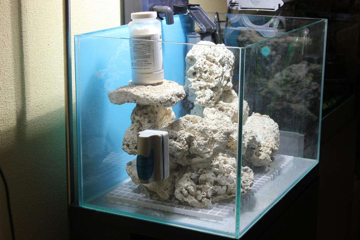 Ну вот вроде все. И случился запуск также стремительно. Натыкал камней, залил все раствором, накидал песка, налил воду, добавил немного свежезасоленнной и через минут 40 выпустил рыбу. Через пару часов тыкнул пару-тройку живых камня. Камни, вода, песок вуаля и морко у меня дома))