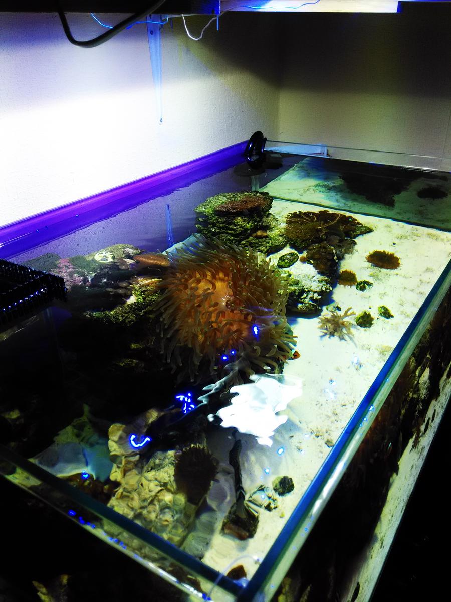 По рыбам осталась одна зебрасома два клоуна и одна собака биколор. Кораллы мягкие взял пару веточек жестких понимаю, что не правильно, но очень хотелось. Актиния другая. Еще попали в аквариум ковровые актинии совсем белые без зооаксантелл..начали вроде приходить в чувства, но вместо того чтобы расти они делятся из 2 уже стало 5, но мелкие((( Аквас еще в нитке и есть немного циано и кораллы пока не в самом лучшем состоянии, но я руки не опускаю