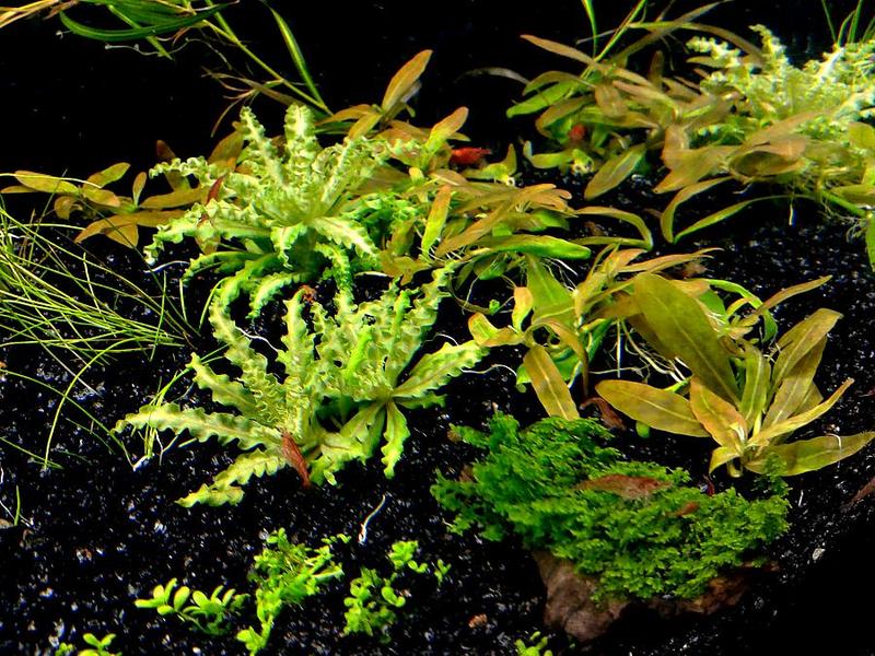 Растения: Куба, Ситняг, Рдест, Риккардия, Погостемон Хелфери, мох батерфляй и еще пару видов, коричневый стаурогин
