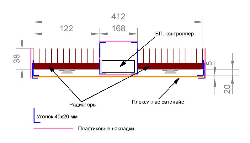 Основу светильника составляют два радиатора соединенные между собой уголками 40х20 по торцам.. Между ними отсек для установки блока питания и контроллера. В отсеке напротив каждой сборки просверлено отверстие для прохода проводов от сборок. Провода к сборкам сначала сделал на разъемах, но видно не дружу я с ними - все время пропадал контакт то там, то тут. Обрезал и подпаял провода к сборкам - так лучше .