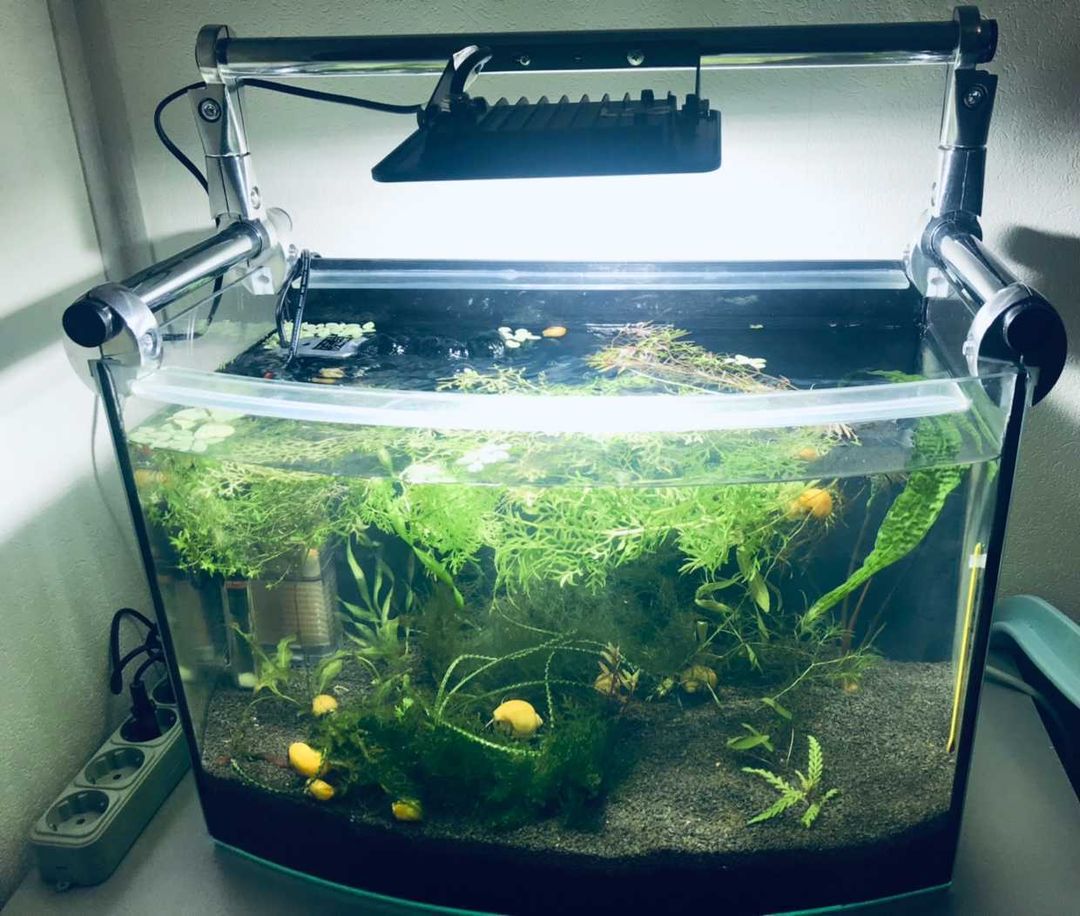 Аквариум достался с крышкой, но понимая что нужен свет, было принято решение ее убрать и установить светильник. Смастырил аля балку  Так же были запущены ампуляшки.