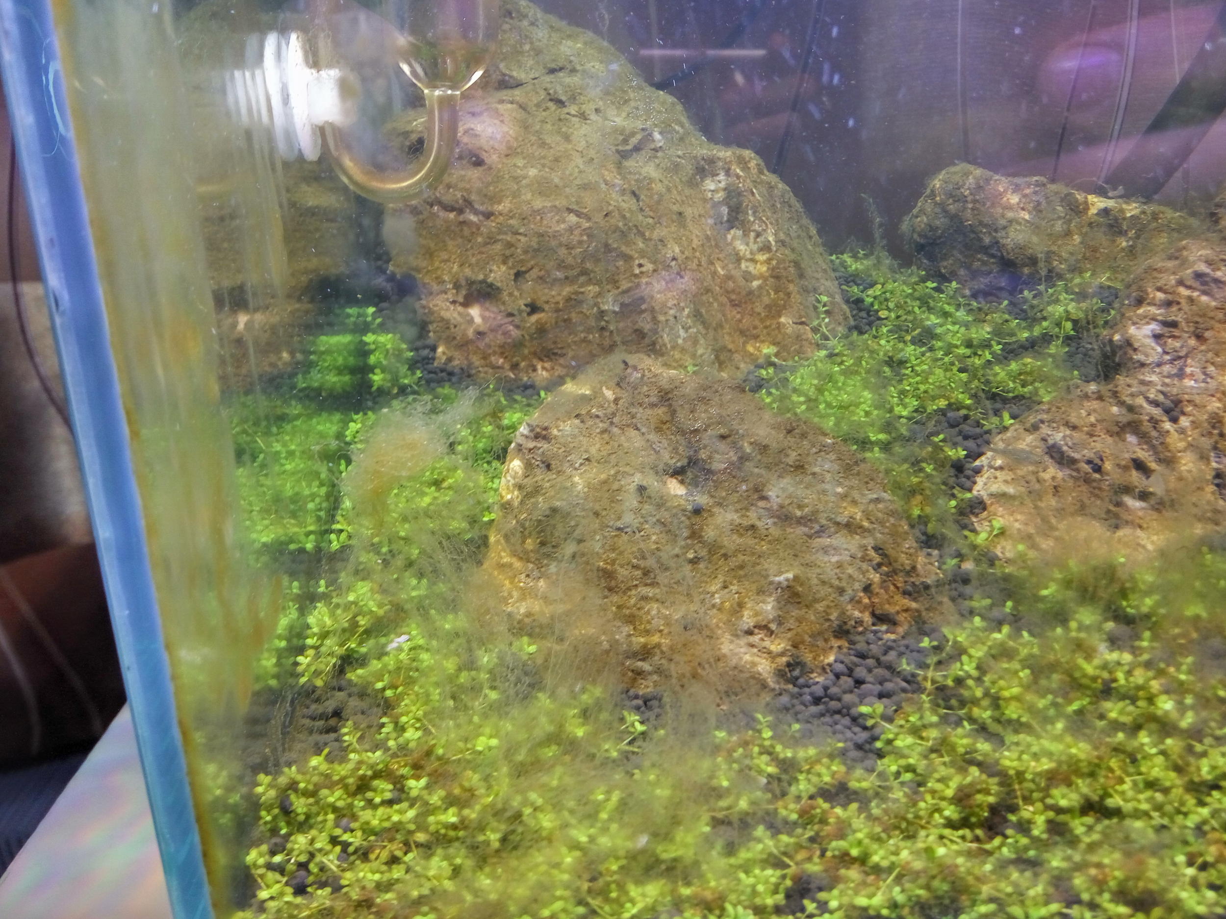 Незадолго после запуска отлучался на несколько дней, по приезду застал вспышку, лечил подливанием перекиси. Сейчас вроде стабильно, куба растет и пузыряет, иногда только стекла чищу и еженедельные подмены воды по 10л.
