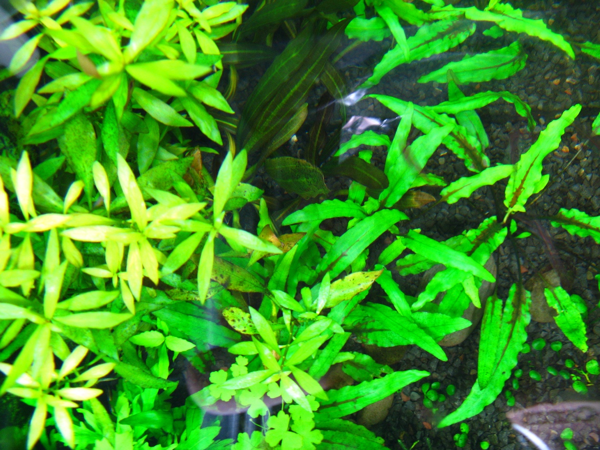 Заменил Валлиснерию на Людвигию мехико (Ludwigia sp. Mexico), добавил "цвета" в эту зелень. Хотя при приближении к 4100 К лампе лювигии и гигрофила многосеменная начинают желтеть. Ещё бы Синему чем-то заменить.. но пока не выбрал чем. Она вроде хорошая, но большой деревиной растёт.