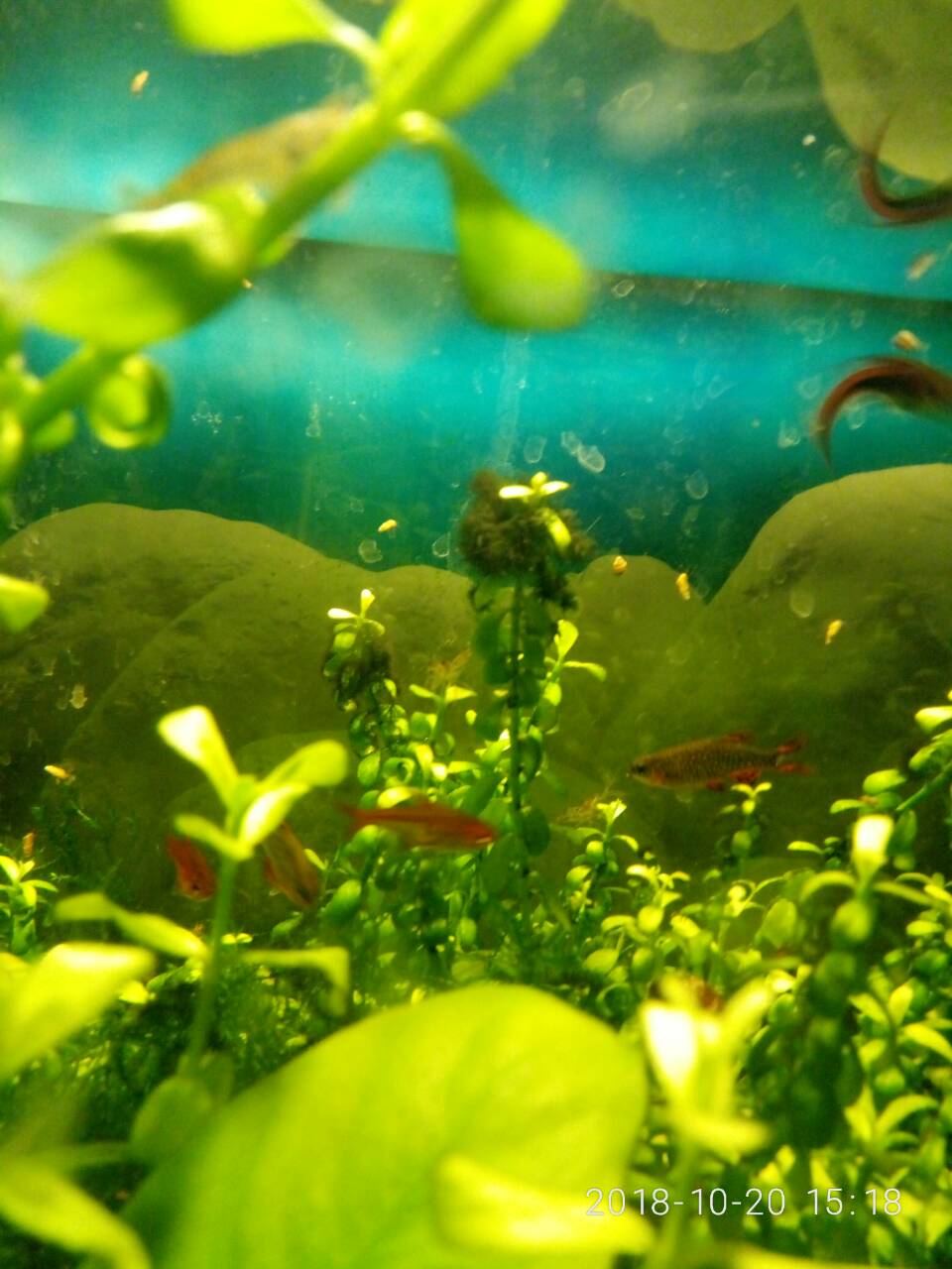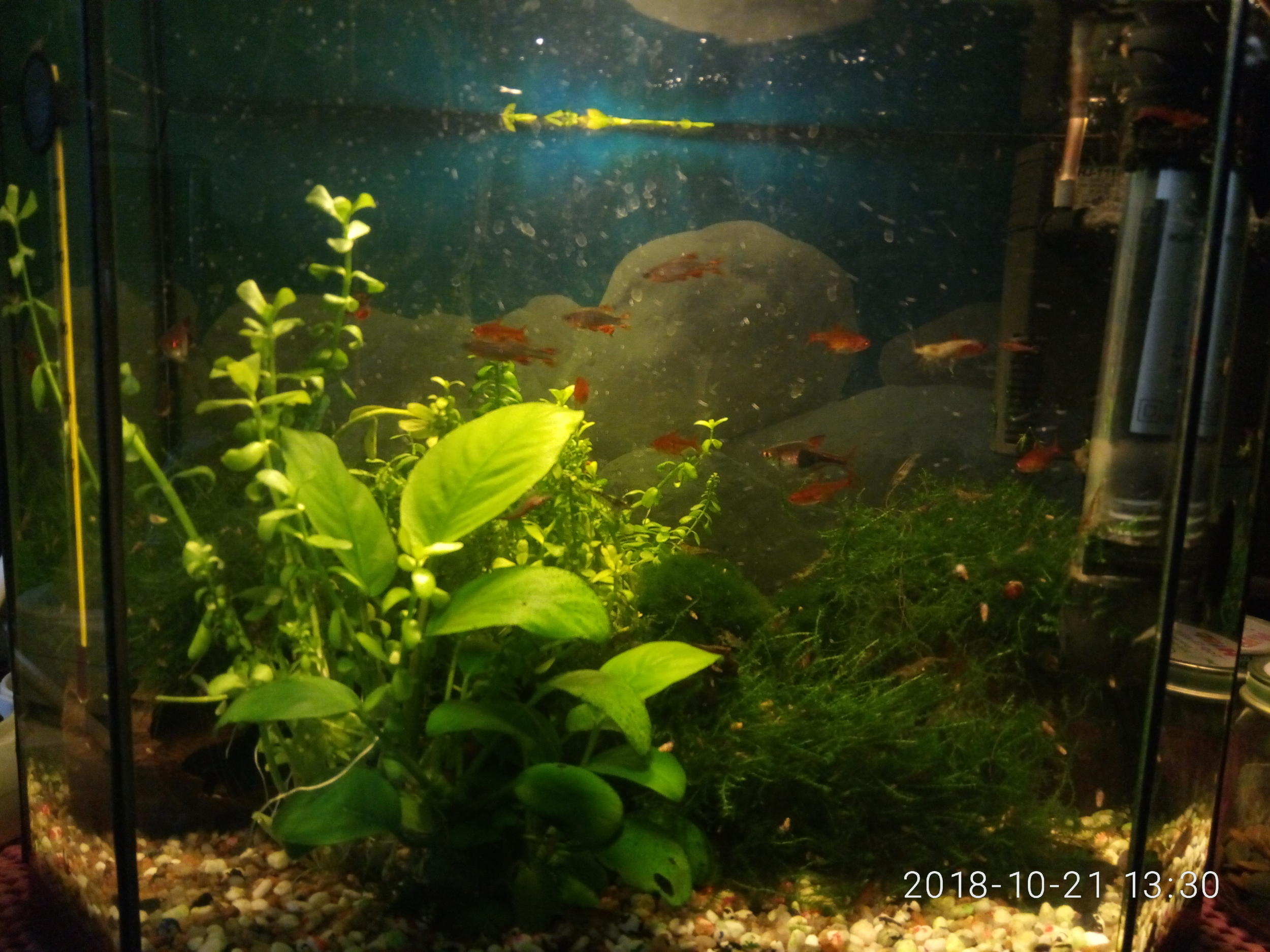 Живность: галактика, тетра аманда, расбора клинопятнистая, крапчатые и креветки.
