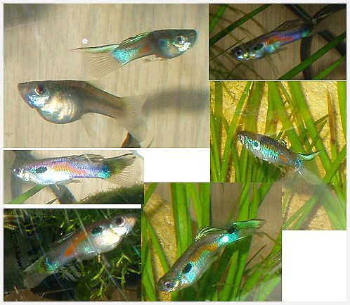 Очень хочется этих гуппи дома иметь! Они такие серенько-желтенькие, с короткими хвостиками, с зелеными, розовыми, голубыми пятнами по телу. Помню, ловили в речке Луганке мальчишки и в школу приносили, раздавали всем жаждущим и не очень  ...и жили они у кого как. В банках трехлитровых - и как же красиво было!! Ну так хочется! Такие вот красочные воспоминания нахлынули... И еще аквариум из детства хочу - без света и других электроприборов - только с регулярными подменами  и полноценным, разнообразным кормом. Уже даже и запустила 10 литров. Стоит на подоконнике, оборудования нет (будет обогрев в холодное время, т.к. проветривание и т.п.). Засадила криптокориной и роголистником. В день запуска (как всегда у меня  ) поселила туда 4 породистых гуппи. Выглядят отлично, аппетит сильный и зверский, за самкой ухаживают, цветы дарят, дерутся между собой - да нормально им в таком по нынешним мерками супермикромини! Думаю еще штучки 4 туда будет в самый раз, так что какие там 10 литров на одну гуппи и 5 литров на одну улитку (  это реальный совет, кстати). Но это не в тему. Про "детских" - где таких найти? Я так понимаю, у наших любителей только породистая нежная красота водится. Посоветовали в Бортничи, но только надо осенью и с бооольшим сачком...но ждать долго и сачок большой...пошить надо  . А может, все-таки у кого плавают короткохвостые дворняжки с цветными пятнышкам? Я бы купила или поменяла на своих. Вот на фото рыбки, похожие на желаемых, на последней - гибрид с гуппи Эндлера или Венесуэла (не помню точно, но очень красиво!).