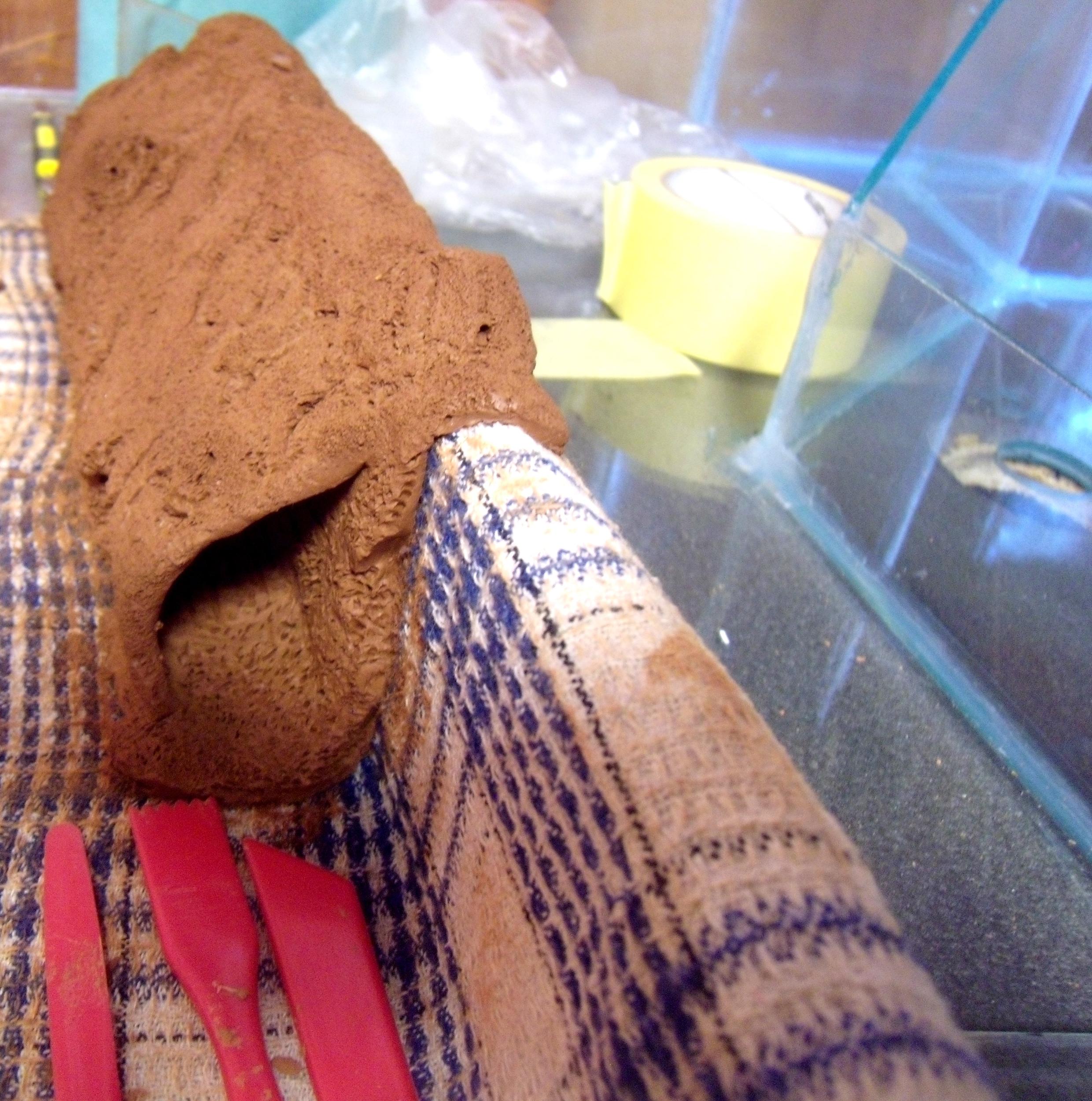 Декор направляющих для течения выполнен из керамики.Пришлось освоить азы гончарства. Глину купил красную , достаточно жирную , обжигалась она при температуре 1 000 С в муфельной печи. Лепка шла по месту и выглядела импровизацией , единственное что... , каждая крупная деталь имеет канал ,который геосессарма ,будущий житель террариума, сможет использовать, как укрытие.