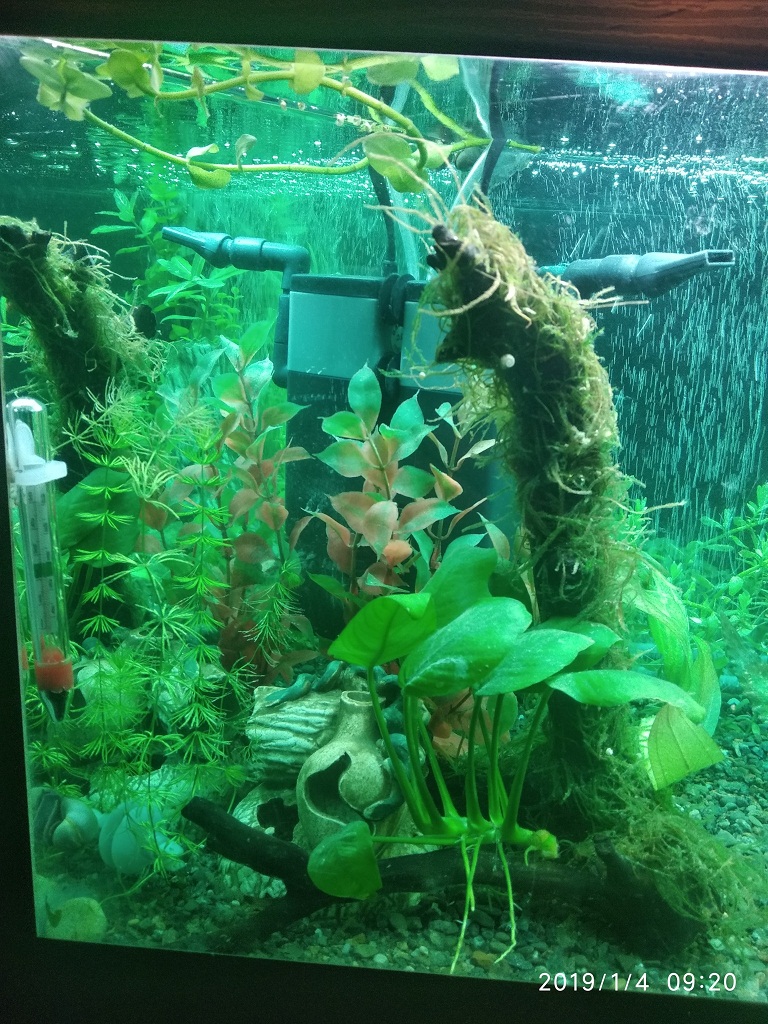 Здравствуйте! Вот решил приобщится к обществу аквариумистов. Но так как аквариумистикой занимался еще в школьные годы, то сейчас возникает множество вопросов и я очень расчитываю на вашу помощь. Немного об аквариуме: трапецевидный (задняя стенка 50см, передняя 80см, боковые по 30см (ширина 26см), высота 34см). Обьем 57л (воды – 52л). Заднее и боковые стекла – зеркальные. Освещение 2 LED лампы (12Вт, 5000К, 1080Лм и 10Вт, 4000К, 850Лм). В процессе изготовления новая крышка со светодиодным освещение 1Вт диодами. Фильтр внутренний ViaAqua F303 (600л/час), компрессор Resun AC-1000 (108 л/час). Температура воды в аквариуме 24-25 градусов). Аквариум был запущен 24.12.2018 года (использовал Rikka Аква Старт, по 5 мл /день на протяжении 7 дней). Из рыбок пока только 5 коридорасов панда и 4 ампулярии. На первое время хочу добавить гупяшек москва ред и неончиков голубых ну может креветочек черри. Замену воды со дня запуска не делал, планирую завтра процентов 25. Из тестов что удалось приобрести – РН при старте был 7,5, сейчас 8,0. Остальные тесты жду сегодня-завтра. Но знаю точно что вода у меня жесткая (накипь на чайнике и т.д.) Освещение на сегодня – 10 часов ( с 11.00 до 21.00). Для декораций использовал 2 коряги ( вишня, вываренная в соли порядка 10 часов, после вымочена порядка 2 суток), камни, 2 гротика, искуственное растение которым прикрыл фильтр. Из растений сразу же были посажены Гигрофила многосеменная, Бакопа каролинская, Людвигия бревипес, Ротала индийская круглолистая, Линдерния круглолистая, Криптокарина Венде, Эхинодорус амазонский и эхинодорус горизонтальный. На левой коряге закреплен Анубиас и яванский мох, на правой Папоротник таиландский и мох феникс. Также к камням закрепил ломариопсис.