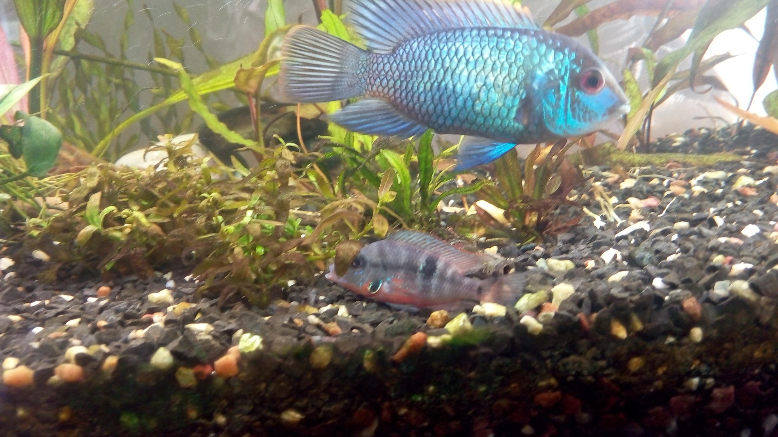 Подвезли мне двух цихлазом Меека. См3.В отсаднике полетел обогреватель. Пришлось сажать в общий сразу. Подлевала им аквариумную воду и дала время привыкнуть. Потом выпустила в общяк.