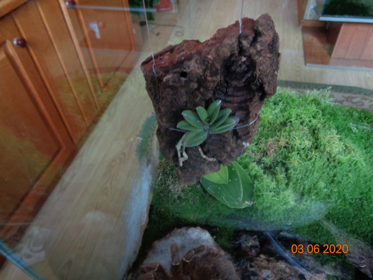 Полив: я поливаю опрыскиванием каждый день дистиллированной водой (летом и зимой) и через день (В МЕЖСЕЗОНЬЕ весной и осенью после отключения и до включения отопления да и летом когда прохладно и влажно) Зимой поливаю при отоплении так же каждый день . НО НУЖНО СМОТРЕТЬ КАК ОНА БУДЕТ ПРОСЫХАТЬ . Но напомню что она у меня будет расти в террариуме где высокая влажность (70-80%) (фото террариума ниже) . Кто то рекомендует блок замачивать. Но важно одно вода для них нужна без солей или осмосная или самый лучший вариант дистиллированная. Иначе будет идти отложение солей на растении оно будет плохо выглядеть да и расти тоже.