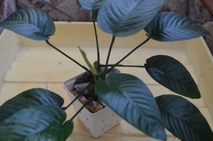 Маточный куст Anubias barteri var. caladiifolia (Engler) выращен под лампами ЛБ в полупогруженном состоянии. Нетребователен к условиям содержания. Хорошо растет в аквариумах. Первичный материал приобретался в Ленинградском ботсаду в 1988 году как «barteri var. barteri » (советский Бартери).
