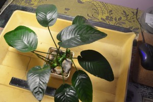 Маточный куст Anubias barteri var. caladiifolia (Engler) выращен под лампами ЛБ в полупогруженном состоянии. Нетребователен к условиям содержания. Хорошо растет в аквариумах. Первичный материал приобретался в Ленинградском ботсаду в 1988 году как «barteri var. barteri » (советский Бартери).