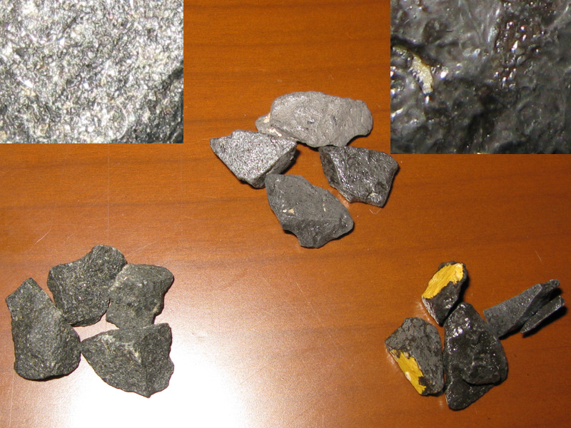 Как выглядит базальт, мне казалось, что я изучила вдоль и поперек! Эти камушки взяла на Птичке. Осмотрела, правда, сквозь пакет - а че мне, "опытному" аквариумисту-покупателю, внутрь заглядывать-то!  Только блестел он сильно, но решила, что мокрый, да и все. Когда дома высыпала в таз, залила водой и стала перемывать, обратила внимание на то, что под водой его блеск не изменился, и в руках он немного тяжелее привычного базальта. В общем, сначала сделала вывод, что это все-таки базальт, так как его форма ничем не отлична от лежащего в аквариуме, но просто покрыт он слоем чего-то и поэтому тяжелее. Запаха нет. По цвету немного отличается, но эта разница видна лишь при рассматривании двух грунтов рядом. И еще - уже фотографируя, обратила внимание, что некоторые частички как бы склеены между собой. Значит, точно чем-то обработан. И на некоторых частичках есть желтые пятна. Или это желтое и есть тот материал, который покрыт черным... не знаю. Знаю лишь одно - хочется рвать и метать!!! В общем, в аквариум ложить сие безобразие я не стала. Можно было бы завтра поехать и попробовать вернуть продавцу эти цацки, но поскольку я даже не спрашивала, базальт ли это...