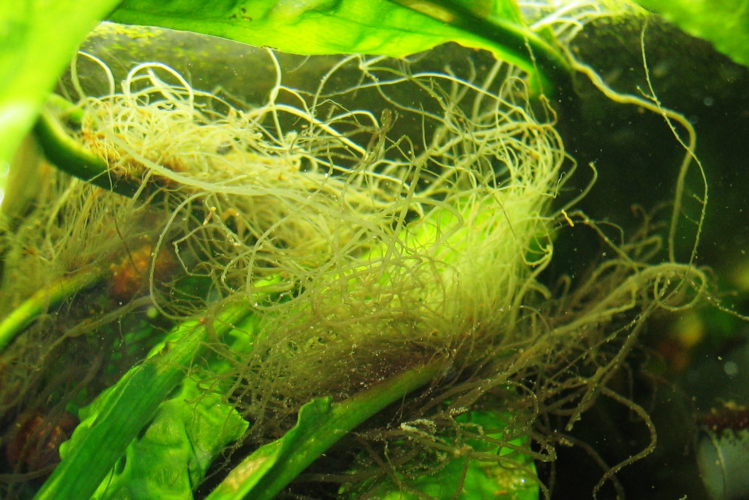 Вроде....Нитчатка - спирогира (Spirogira) ... Появляется при избытке фосфатов и нитратов, при сильном освещении...(длинном световом дне). Легко убирается руками... Регулярный уход за аквой - и проблем нет)) Наладьте подмены воды и сифонку.. Отрегулируйте свет....