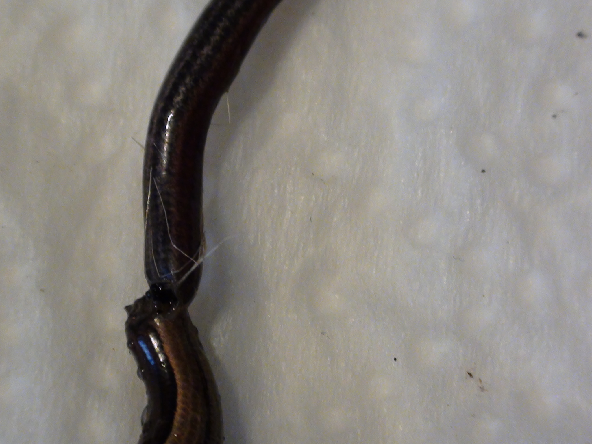 Здравствуйте, подскажите пожалуйста, может ли выжить веретенеца, если у нее обрублен почти весь хвост? Веретенеца около 15 см. Обрубленный хвостик не совсем отделен от тела. Он весит на чешуе и прилегающей к ней мягким тканям - это все примерно 10%. Рана затянулась. Сама ящерица имеет здоровый бронзовый , "переливающийся"цвет, а вот хвостик похудел и стал матового цвета. При передвижении хвостик абсолютно неподвижен и не дает ей двигаться, он ее держит, как якорь. Также был ушиб -темное пятно под кожей. Но он стал меньше.(см фото)