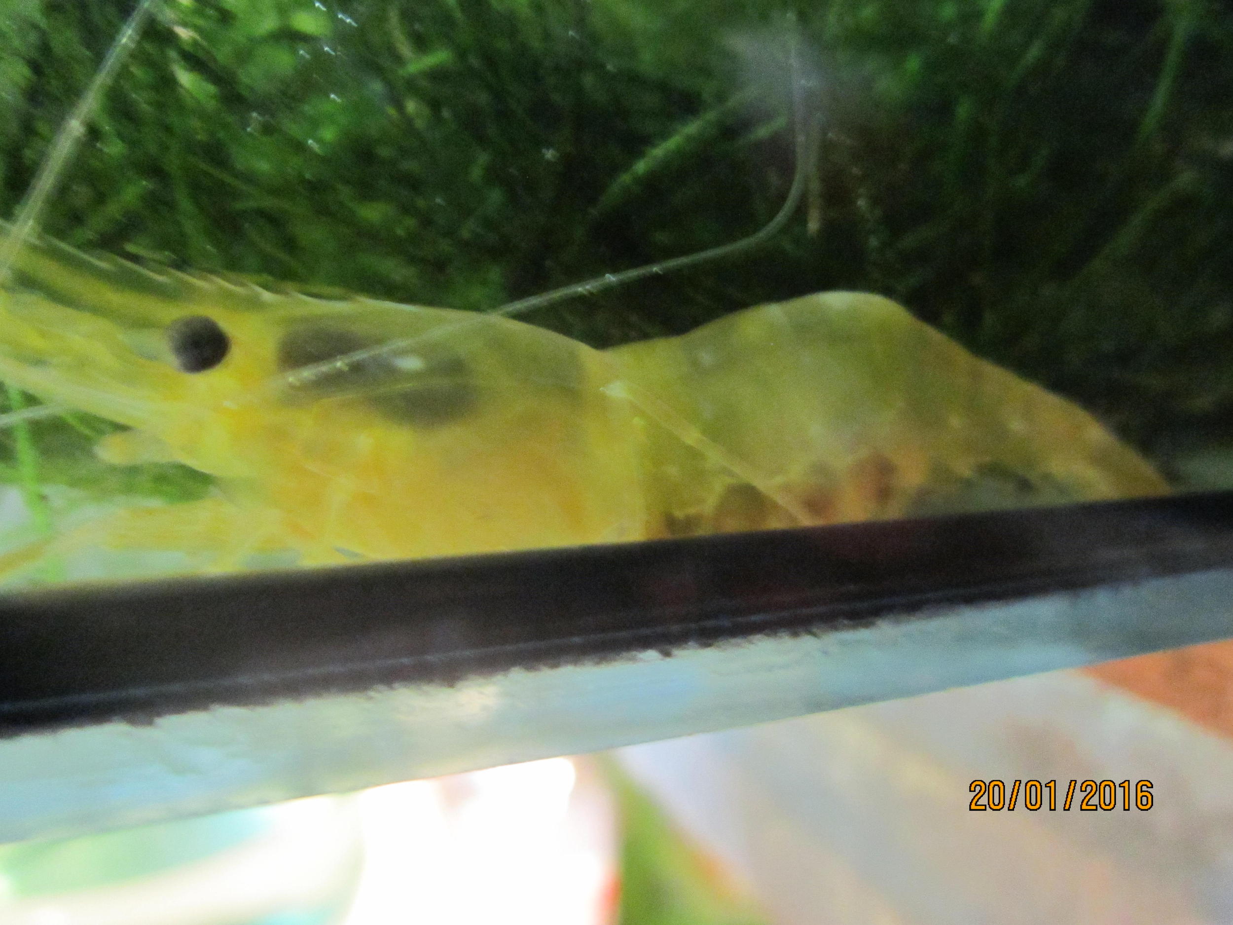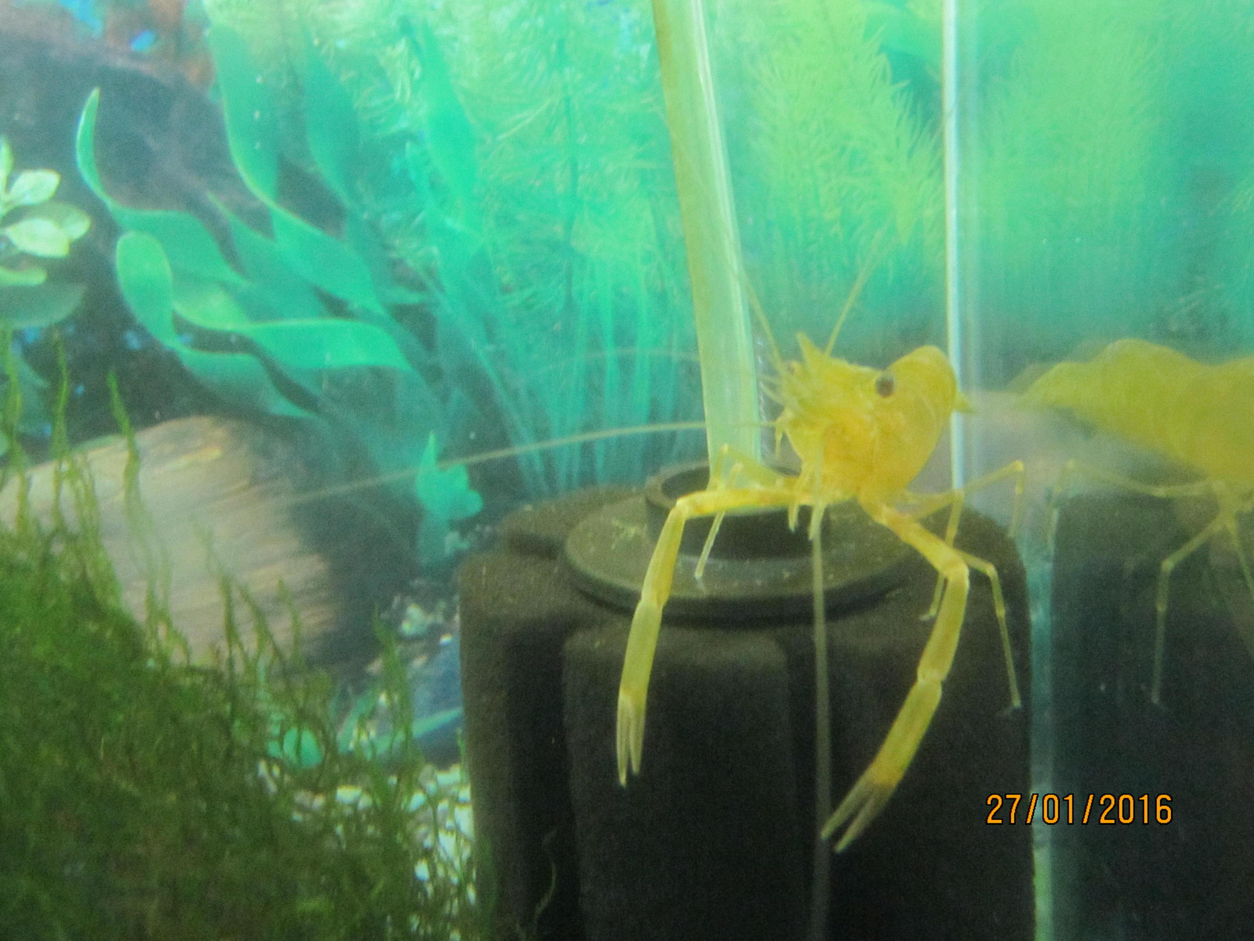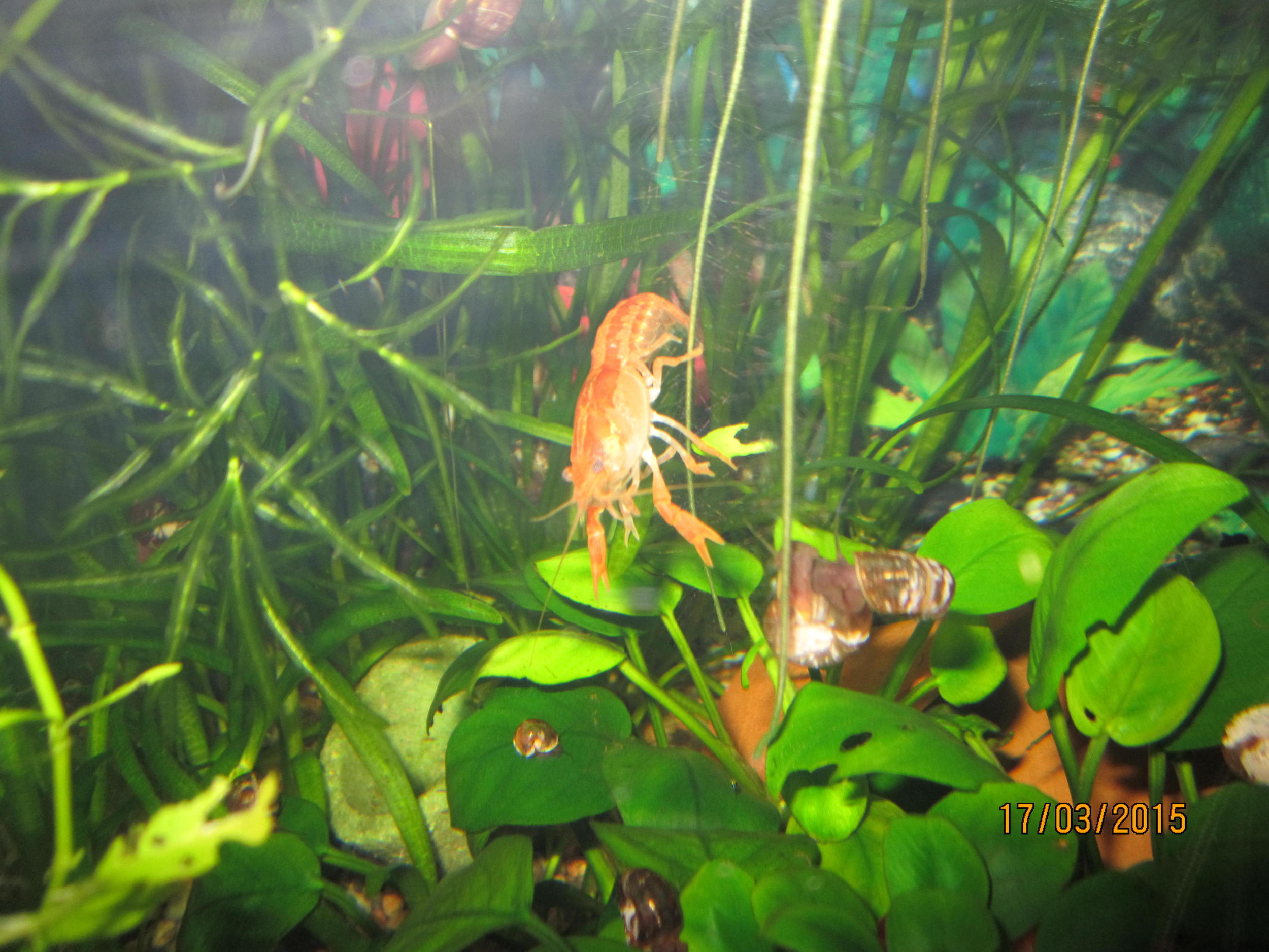 Ещё у меня живут креветки, которые попали ко мне под названием Macrobrachium yellow. Точно видовое название не определил.Мне кажется это выведенная цветовая форма Macrobrachium assamense(assamensis). С рыбой не держал.Сородичей, которые полиняли и малышей кушают,хотя живут в нормальном объёме и не голодают.Растения не трогают. Фото мои. Извиняюсь за качество.