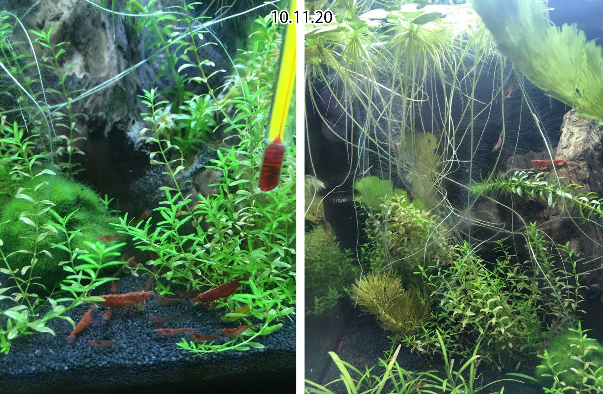 Аквариум запущен 20 августа 2020 года. Сначала все было хорошо, проблем с водорослями не было, растения бурно разрослись. Креветок со старого аквариума (четыре взрослые и штук 60 подросших деток) я переселила в середине сентября. Они тоже чувствовали себя хорошо и после мелкой банки в которой жили раньше пустились в активный рост (но ненадолго).