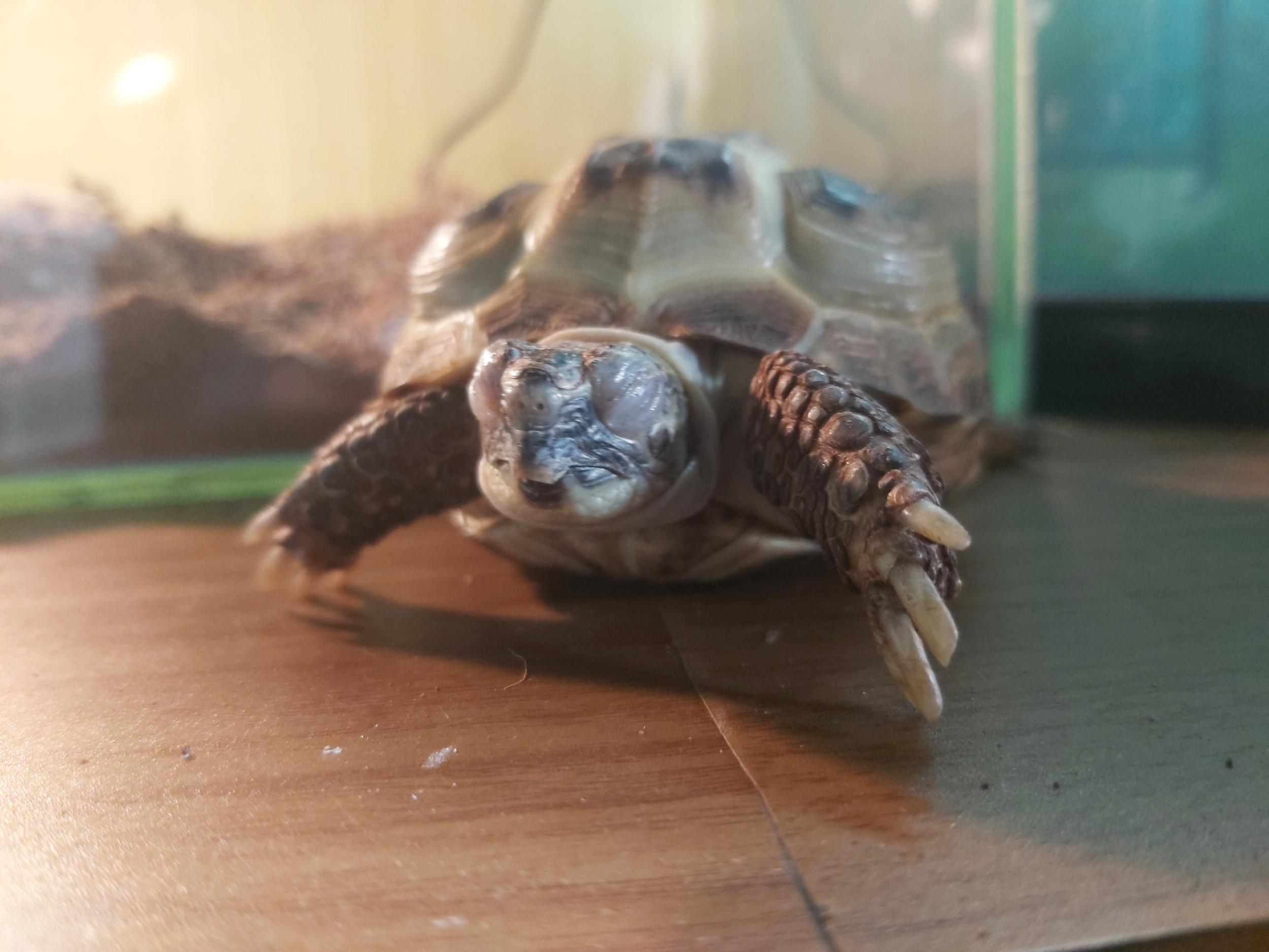День добрый! Пишу вот с таким вопросом: после того, как мы разбудили черепаху после спячки она никак не откроет глаза. Причём она продолжает ходить-бродить и делает это с закрытыми глазами. На гиповитаминоз и на конъюнктивит не похоже по симптомам. На форуме видел похожую ситуацию и там говорилось, что черепаха просто обезвожена. Будили в пятницу ( дня 3 назад ) и все эти дни активно купали и промачивали глазки водой и глазными средствами ( с чувством меры, чтобы не было перебора, а то мало ли ). На данный момент немного открывает левый глаз. Содержится в типа террариуме ( стеклянная конструкция ). Стоят 2 лампы: УФ и нагревающая. В качестве подстилки лежит кокосовый грунт. Прикладываю фото тортилы со всех ракурсов. Мне нужно знать, болезнь ли это или простое обезвоживание после спячки? Как и чем возвращать тортилу к обычной жизни?