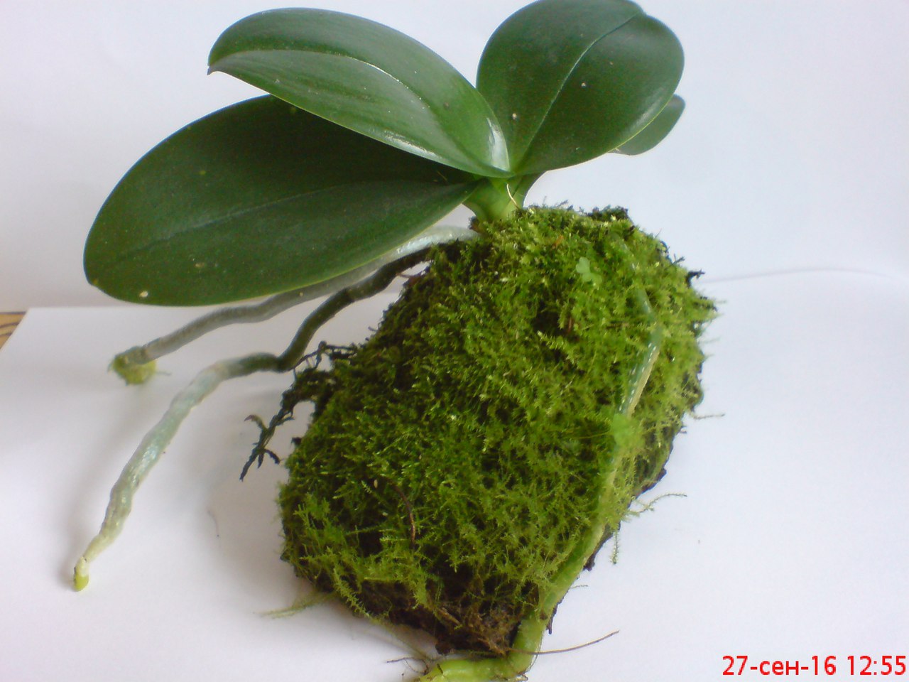 Хочу показать, как я посадил свой мини фаленопсис, и чтоб вы увидели, как растет он при достатке влаги и правильной посадке под литья, так как и садит производитель (можно убедится в магазине, посмотрев, как посажены продажные фаленопсисы). И так, в феврале 2015 года я купил мини фаленопсис (даты смотрим на фото) с половиной пересушенных и мертвых корней. Сразу посадил его в мох под самые листья, ничего не обрезал. Мох все время мокрый. Не прошло и месяца, как полез новый листик. Я НЕ ПРИЗЫВАЮ ЗАЛИВАТЬ. Я ПРОСТО ХОЧУ ПОКАЗАТЬ, ЧТО ПЕРЕСЫХАНИЕ ТАК ЖЕ ОПАСНО, КАК И ЗАЛИВ.
