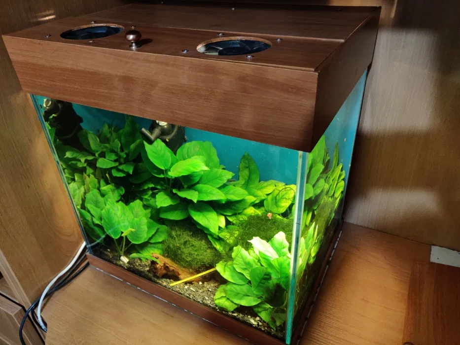 Клеен на заказ из качественного очень прозрачного стекла 5мм. Аквариум "работающий". В комплекте несколько кустов анубиаса, два вида мха, коряжка, фильтр (Aquael Fan-1). Освещение - две лампы по стандартный патрон (Е27), лампы в комплект не входят. В крышке есть вентиляторы для охлаждения летом + в комплекте крышка без вентиляторов. Из живности : данио-рерио, тернеции, сомик-коридорас, креветки неокардины, улитки теодоксусы, мелании и катушки.