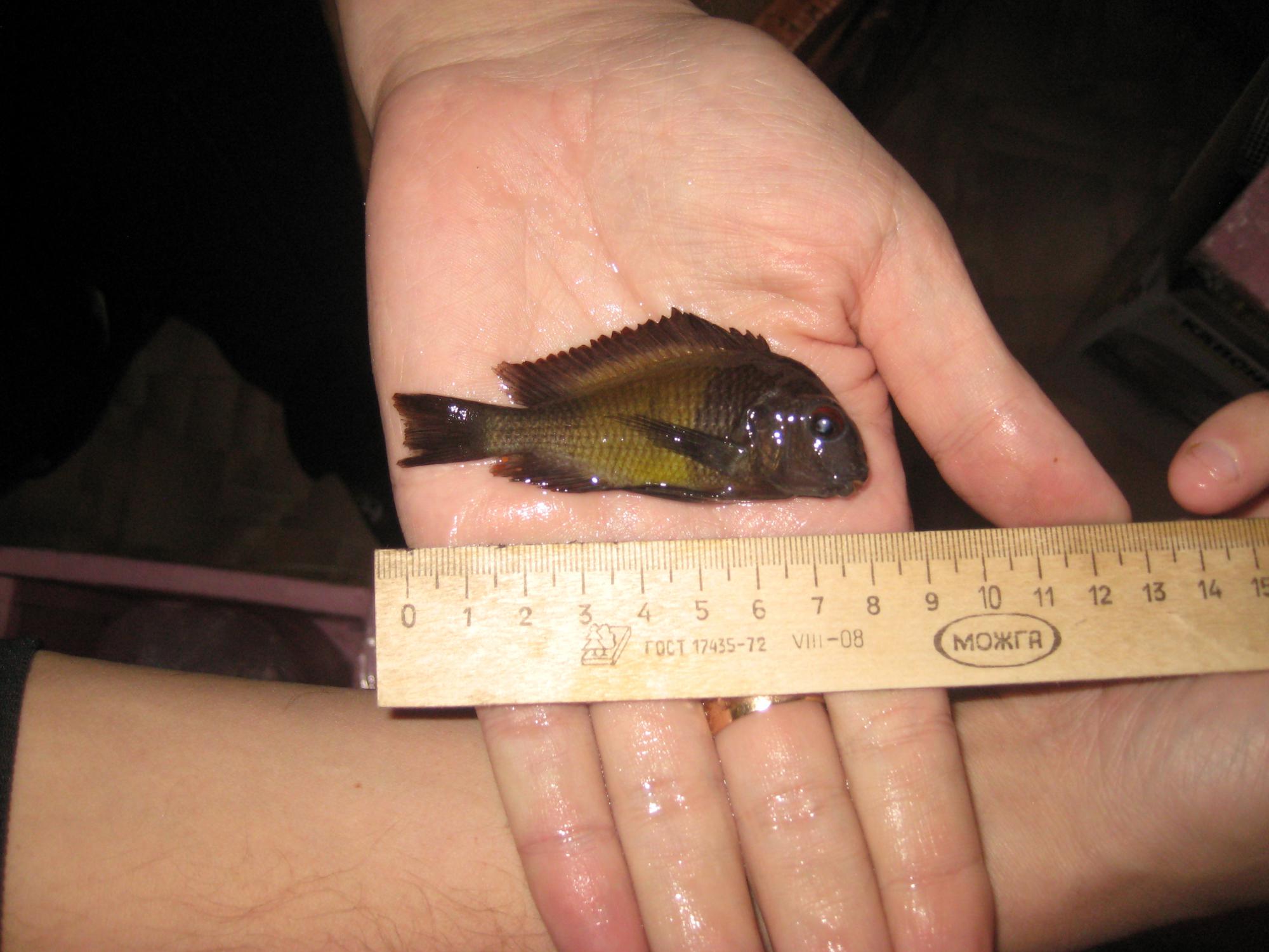 Как видите, человек ни разу не упоминает о качестве рыбы, его больше заботят другие вещи. Я обещал ему ответить на все его вопросы и кажется подробно это сделал. В завершении хочу сказать, что цель этого опуса не сказать, что вся рыба продаваемая вышеназваным продавцом плохая, отнюдь, как то брал у него мальков эретмодусов, претензий нет. Но в данной, конкретной сделке он повёл себя как АФЕРИСТ и НЕГОДЯЙ!!! О чём я и предупреждаю одноклубников и просто любителей Танги. Более красноречиво прокоментируют ситуацию, сделанные фото "супер трофов". На двух, на ладони для сравнения, лежат две рыбки одного возраста (мы не поленились и поймали мою самку), как говорится ощутите разницу.