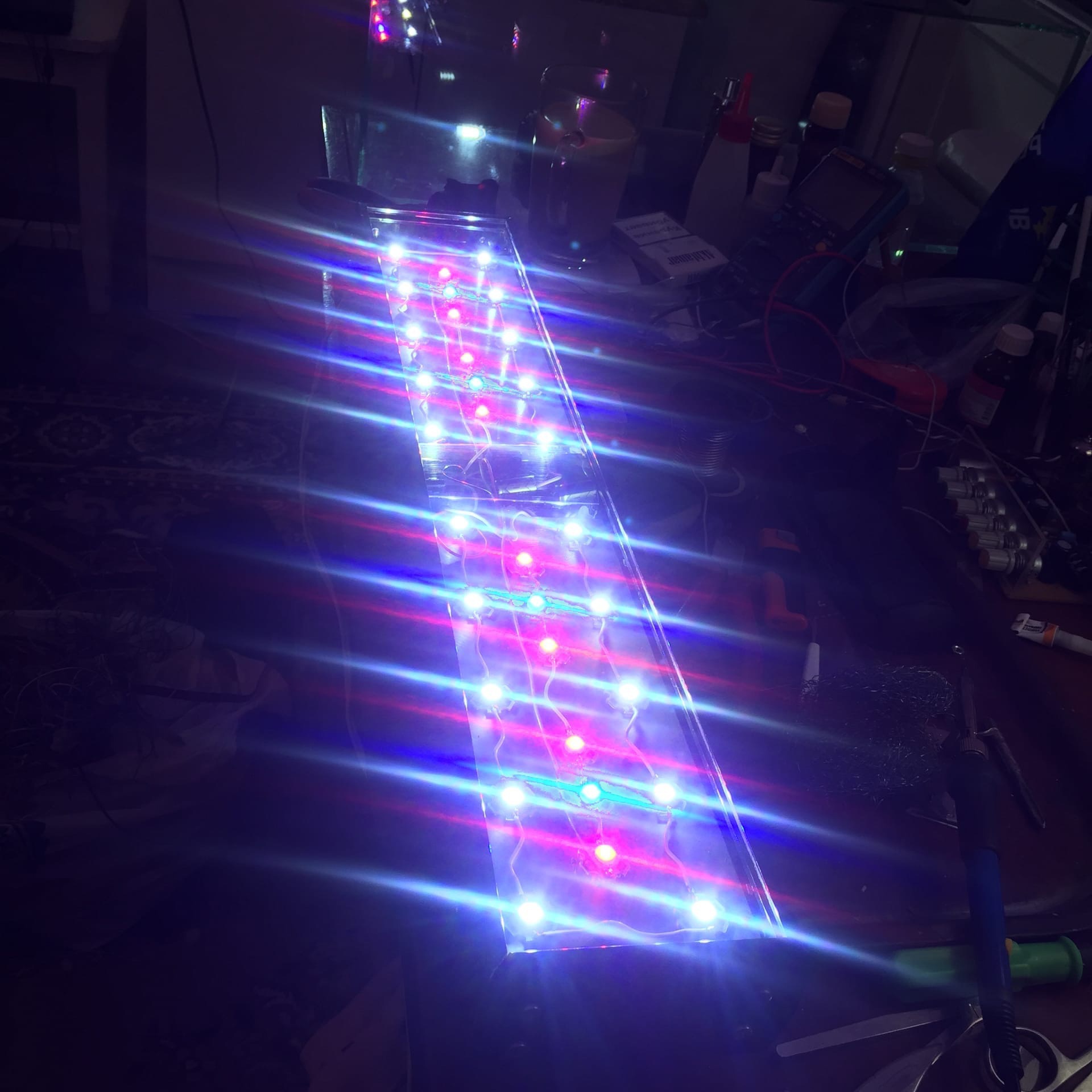 Света еще не было и было решено запустится пока что с прожекторами и походу дела уже думать со светом) поэтому сначала был запуск потом делался свет в течении недели. Как оказалось с алюминием на который можно прилепить диоды у нас оказалось все ну ооочень плохо. И как то раз случайно набрел на радиорынке на пару радиаторов по типу Ёж отлитых судя по всему местными умельцами, но качество было приемлимым и сразу их прибрал к рукам) очень хотелось что б все имело эстетический вид и нужно было обромление для этих радиаторов и под руку попался старый рекламный Лайт-бокс и собственно вот что получилось