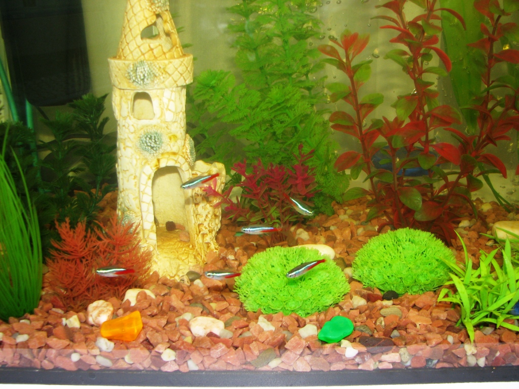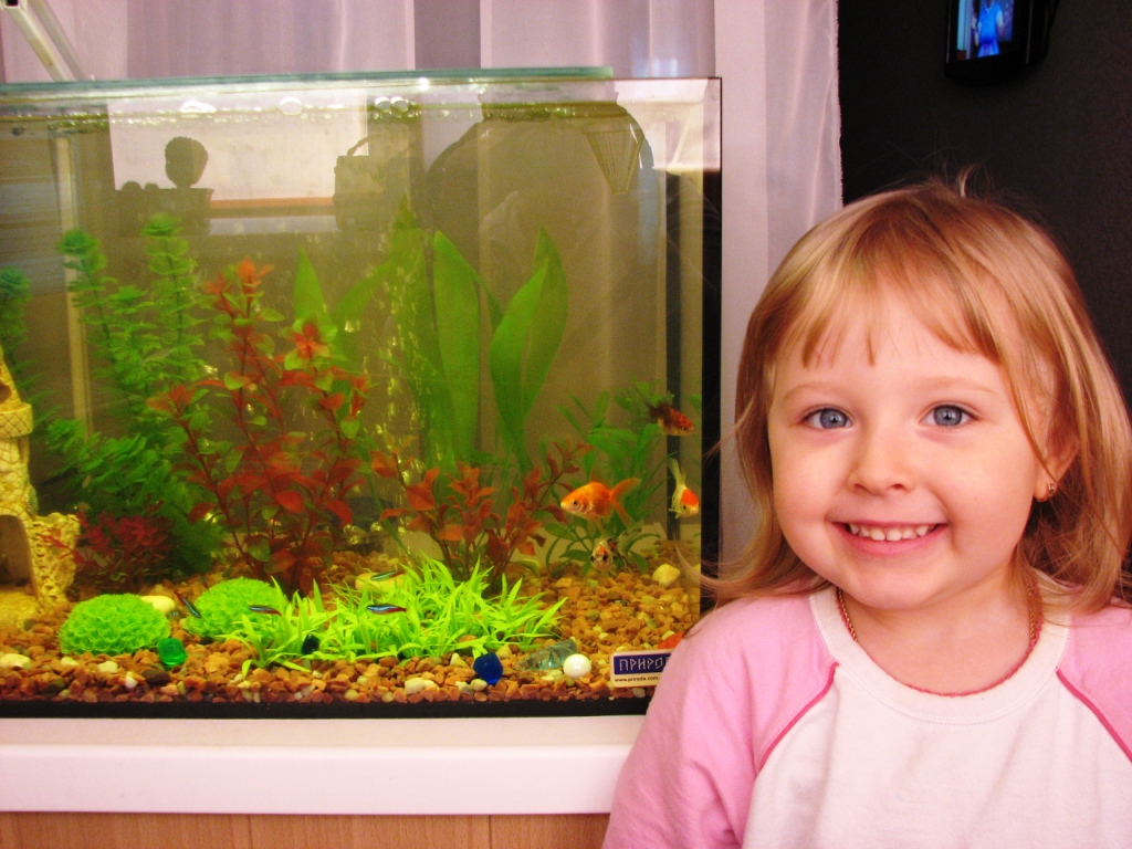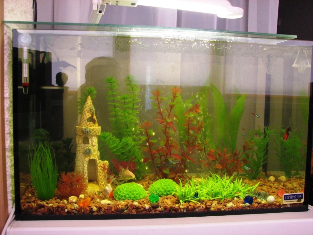 Да дело в том, что я уже, наверное, год просила аквариум у мужа, люблю все живое, у нас дома еще и хомячок! Читала много о воде, о рыбках, знаю, что золотушки любят ковырять дно, съедают зеленуху (поэтому водоросли у меня искусственные). Муж-то, собственно говоря, купил мне акву, фильтр и компрессор. Не успели о таком подарке узнать родственники, как в течение недели у меня появились 5 золотух, и 6 неонов. Хотя я читала, что 65л. это мало для такого количества рыб, но уже ничего пока не поделать. Читала также, что как только неон сможет поместиться у золотухи во рту, она его съест, но я надеюсь на чудо!!! Одно радует, что мужу тоже аква пришлась по душе, так что надеюсь, что пусть не в этом году, но у меня появится более большой аквариум!