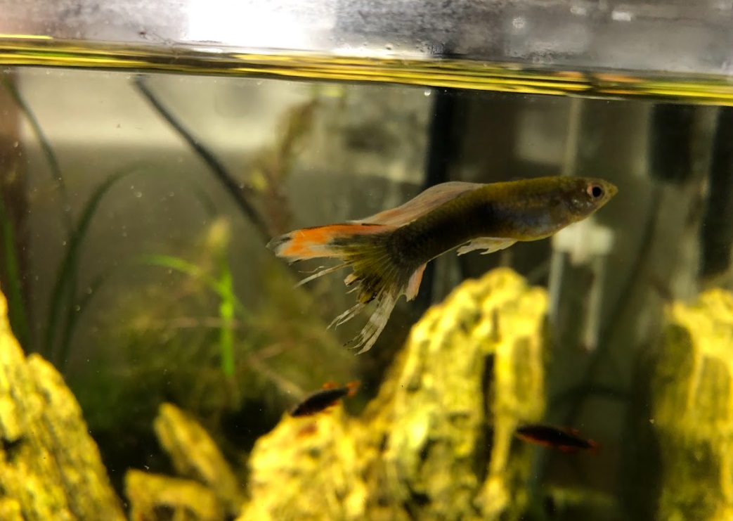 - 1 старый крупный гуппи, куплен взрослым при запуске ≈4см