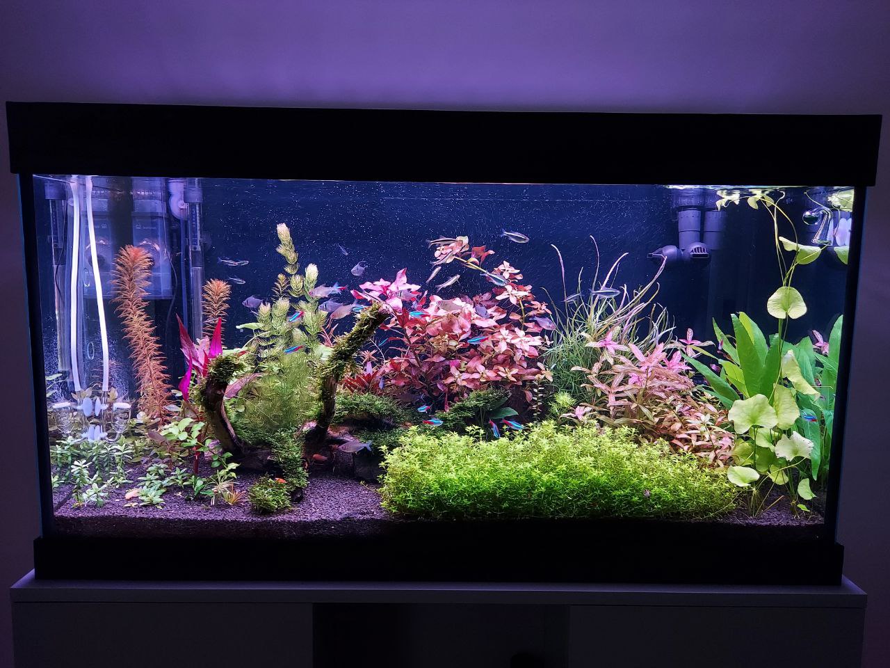Доброго дня, використовую подібну модель але трошки новішу (керування винесене ззовні) в травнику 200л - 2 світильника по 42w. Що до спектру то рослинам дійсно важливий спектр!! Якщо буде перекос в сторону якогось спектру який рослинам не потрібен - виникне вспишка водорослів. Для себе я вивів самі дієві настройки по світильниках: W45% R70% G35% B50% - загальна потужність світильника 50%. Плавний пуск до половини потужності - 15хв, пів години працює в такому режимі і 15 хв плавний пуск до заданої потужності; Світловий день загалом 10годин (8 годин тільки світить повну - 1 година схід-захід) Рослини ростуть чудово. Фото акваріуму додаю